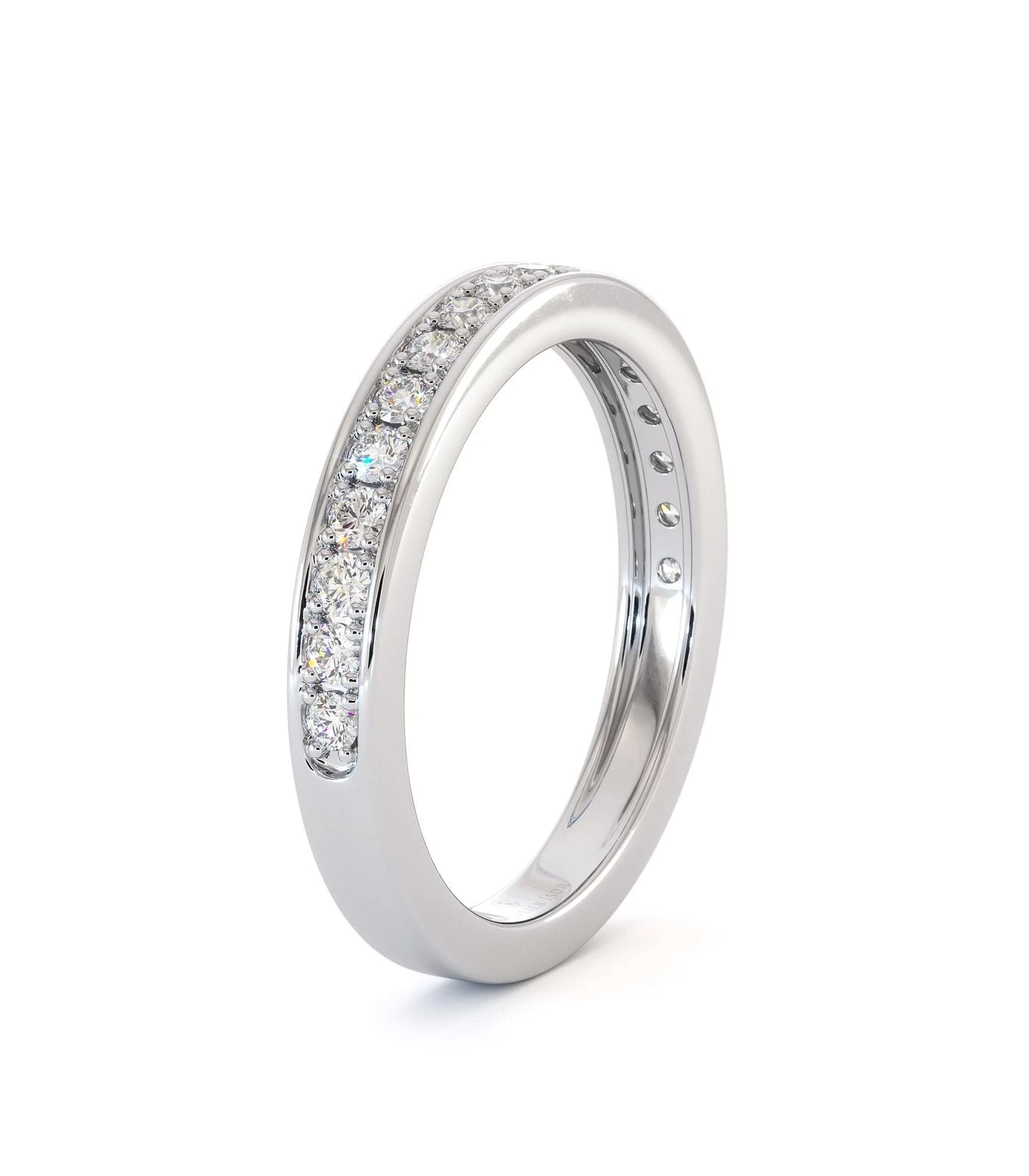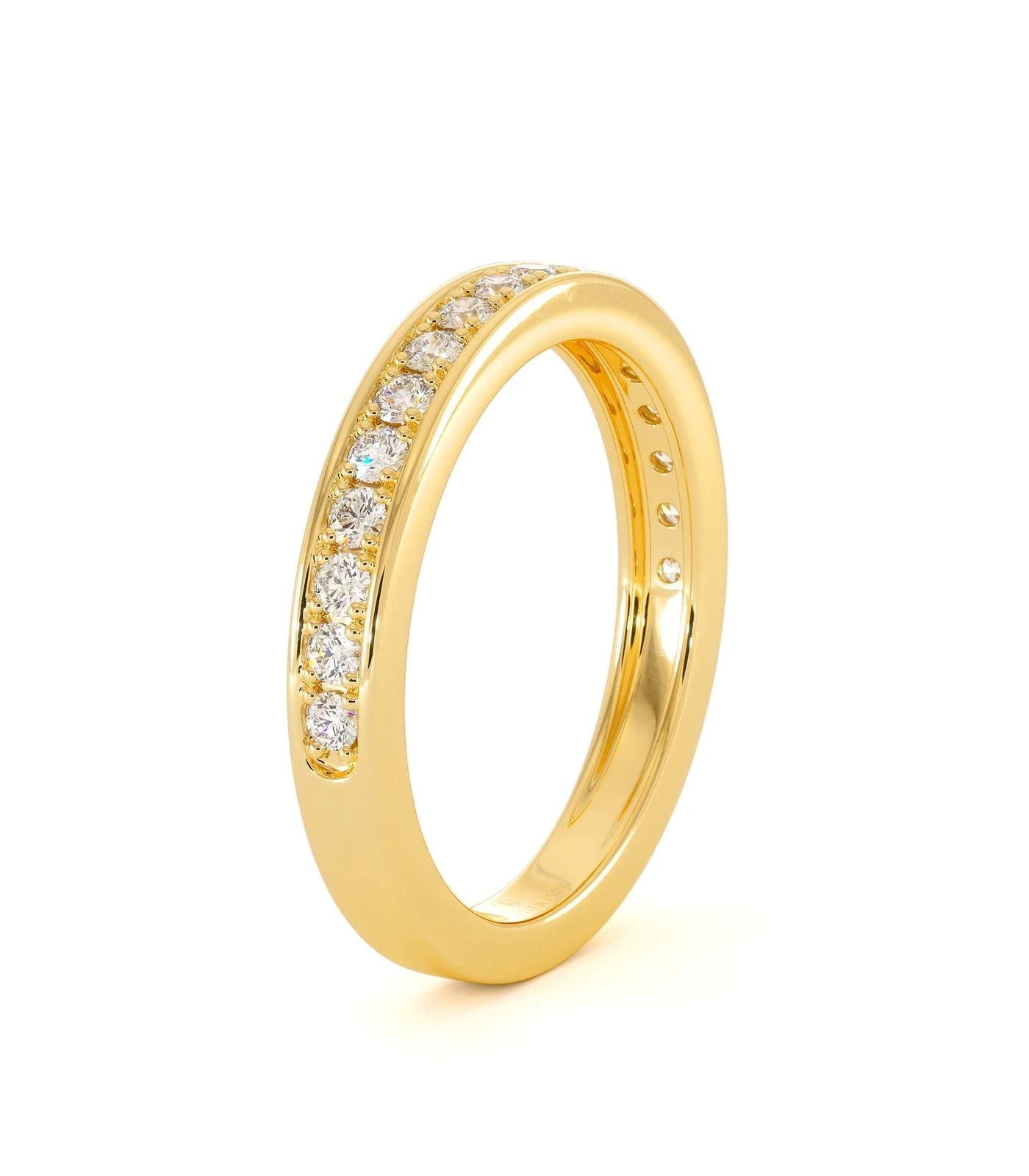 Alliance Mira en or 750/1000, sertie grain de diamants taille brillant. Un style raffiné et équilibré, idéal avec le solitaire Sisley. Poids total diamant : 0,20 à 0,40 ct.