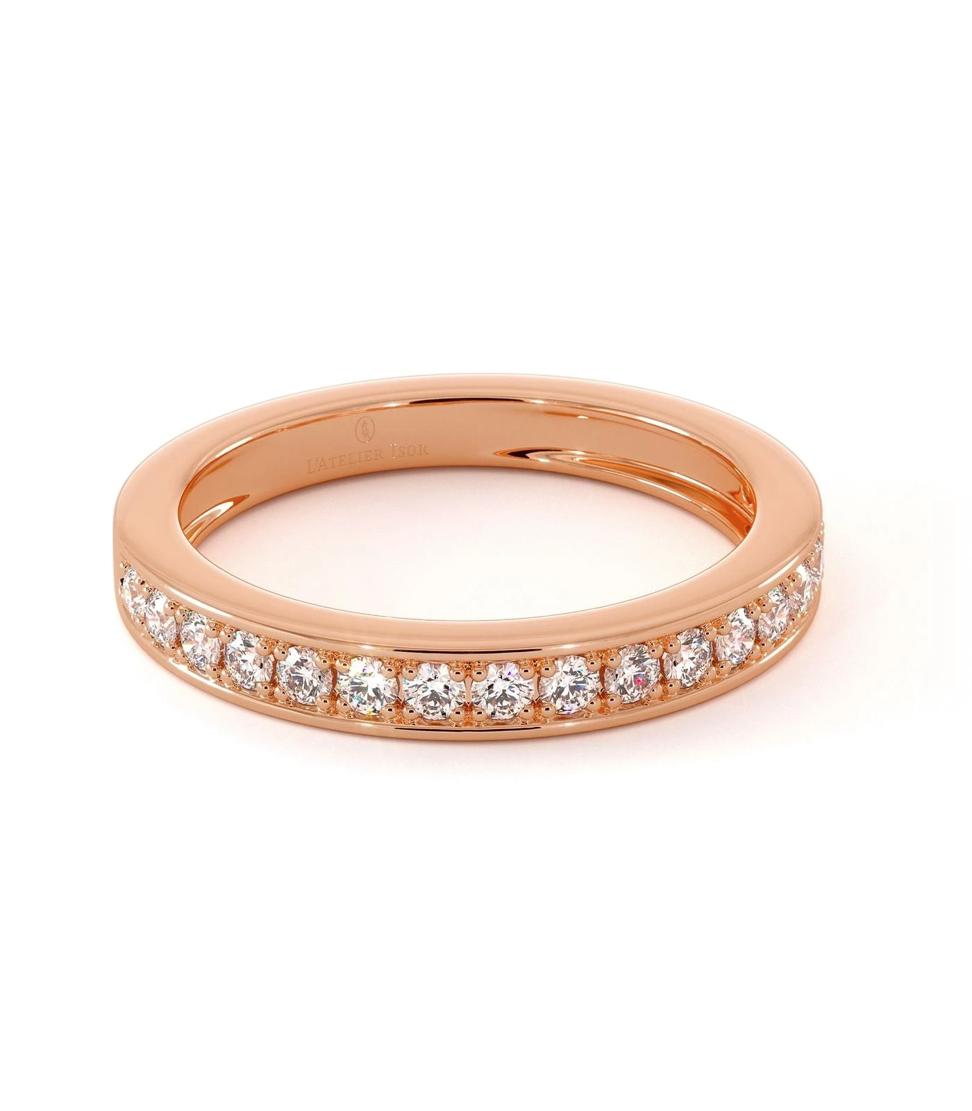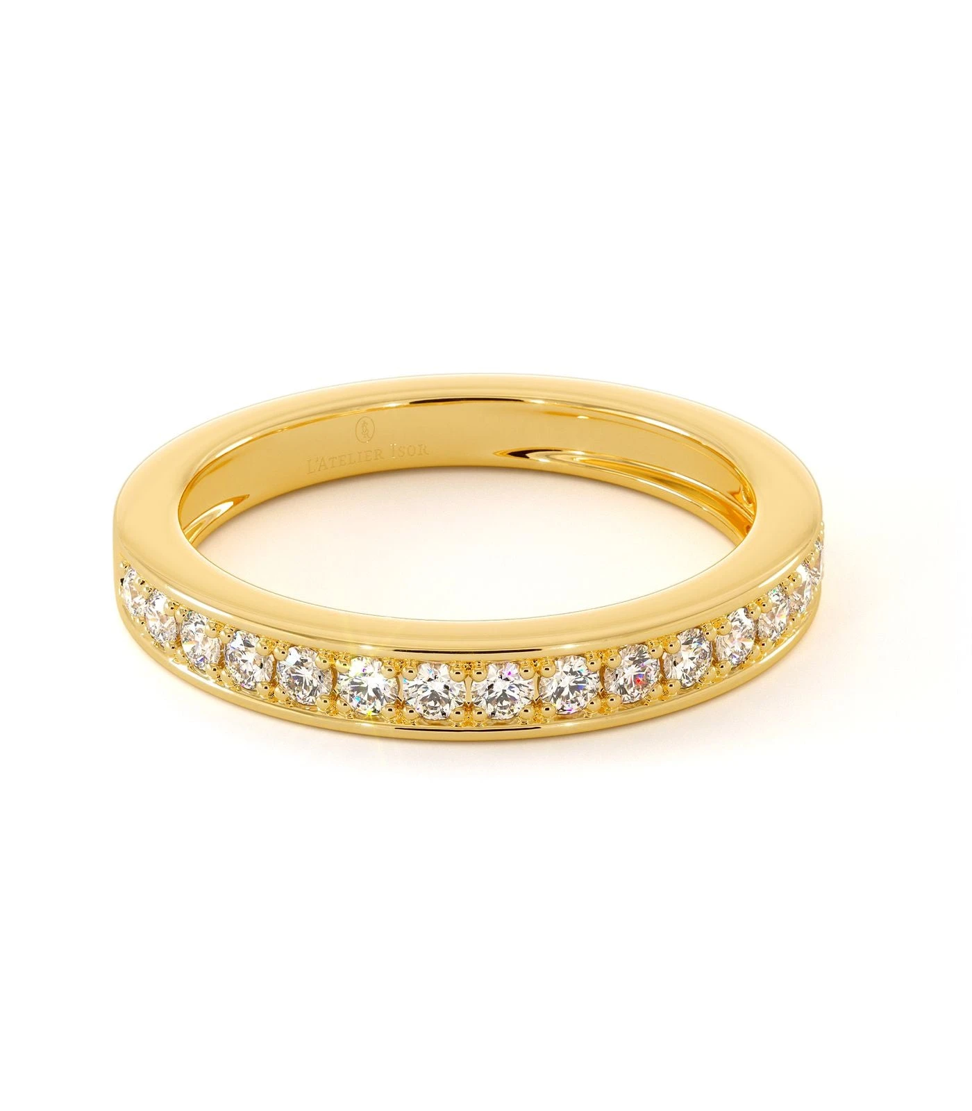 L’alliance MIRA en or 18 carats est sertie grain par de petits diamants méticuleusement disposés pour un effet lumineux intense. Allant de 0,20 à 0,40 poids carat total, l’alliance MIRA, par sa régularité géométrique, se distingue par son style sophistiqué et élégant. Cette bague de mariage se porte à merveille avec le solitaire SISLEY.