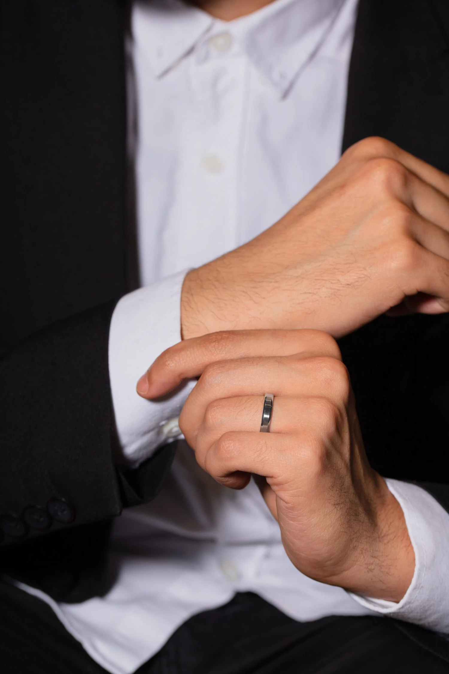L’alliance NORI en argent 925/1000ème se distingue des anneaux traditionnels grâce à sa double finition. Légèrement bombée et brossée en son centre, l’anneau en demi-jonc dispose de contours biseautés pour un rendu moderne et masculin.