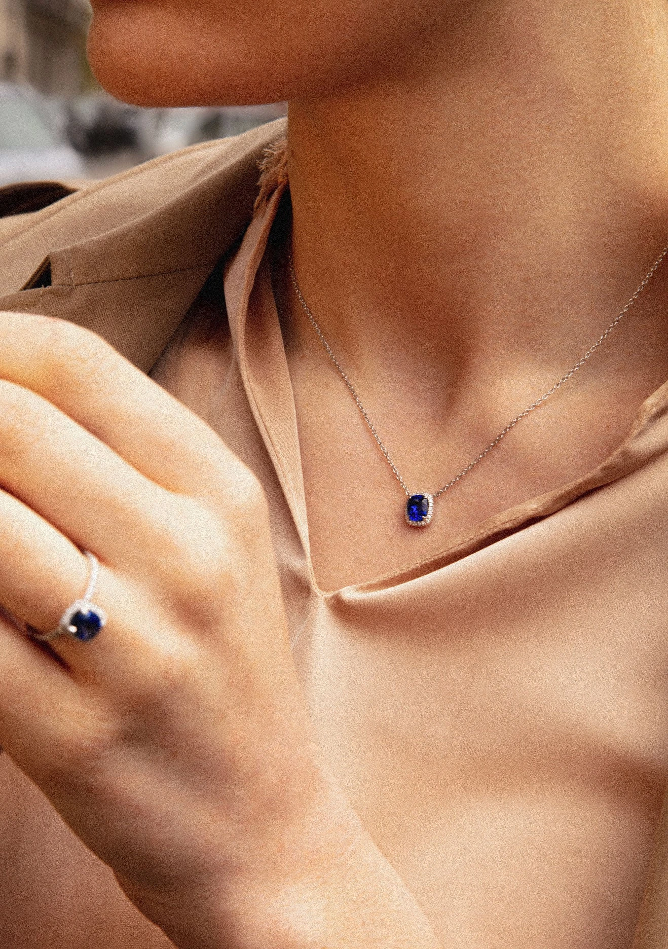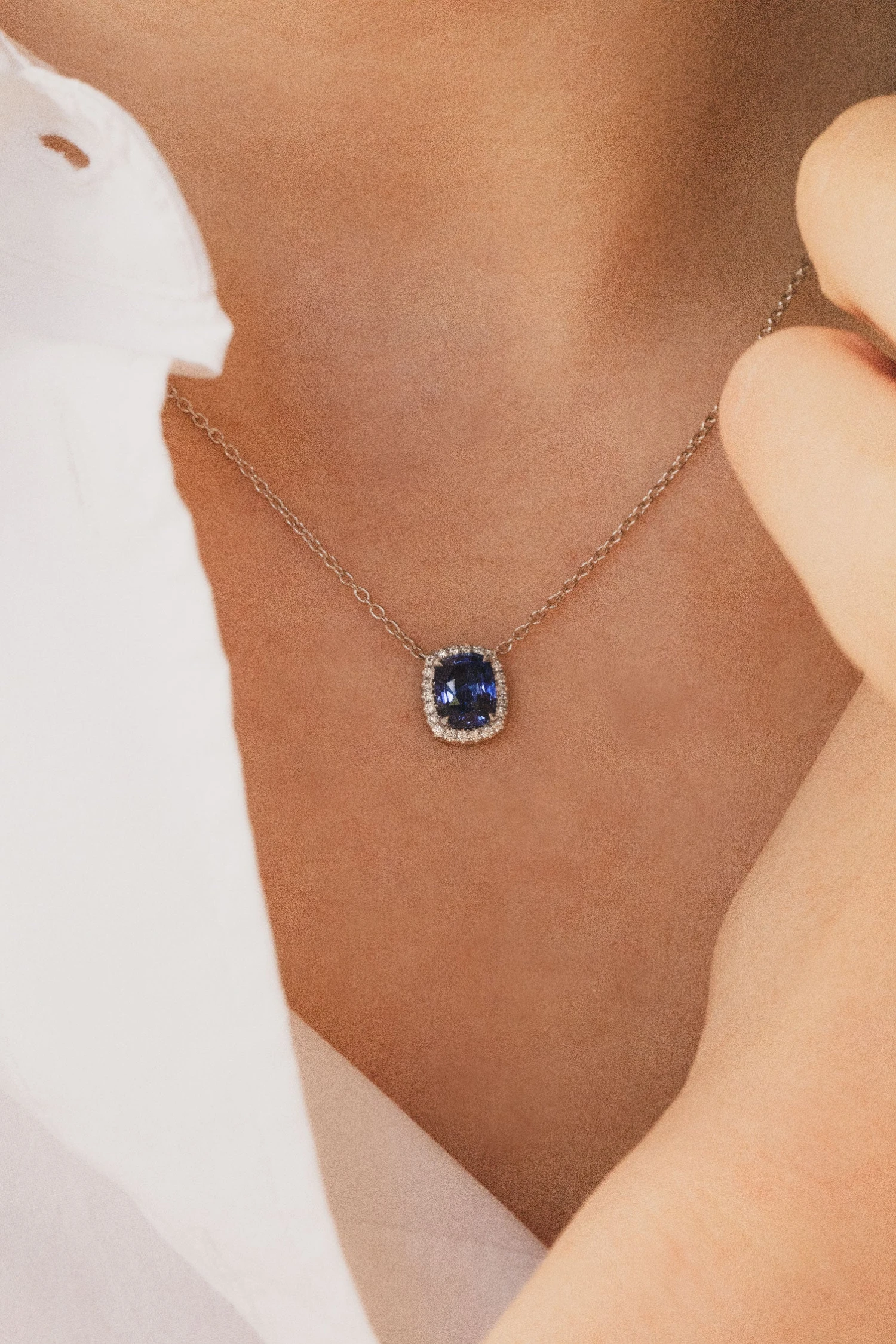 Ce collier en or blanc est un bijou de haute qualité, orné d’un magnifique saphir de forme coussin allongé et de plusieurs diamants étincelants. Le saphir a une teinte bleue profonde et riche, qui attire le regard et donne au collier une allure majestueuse. Les diamants, quant à eux, ajoutent une touche d’éclat et de brillance, accentuant la beauté naturelle du saphir. Le design élégant et sophistiqué du collier fait de lui un accessoire idéal pour toutes les occasions, qu’elles soient formelles ou décontractées. Il est à la fois moderne et intemporel, avec une apparence luxueuse qui attire l’attention de tous ceux qui le voient. En somme, ce collier en saphir de forme coussin allongé et diamants, en or blanc, est un bijou d’une grande valeur et d’une grande beauté, qui fera une addition exceptionnelle à toute collection de bijoux.
