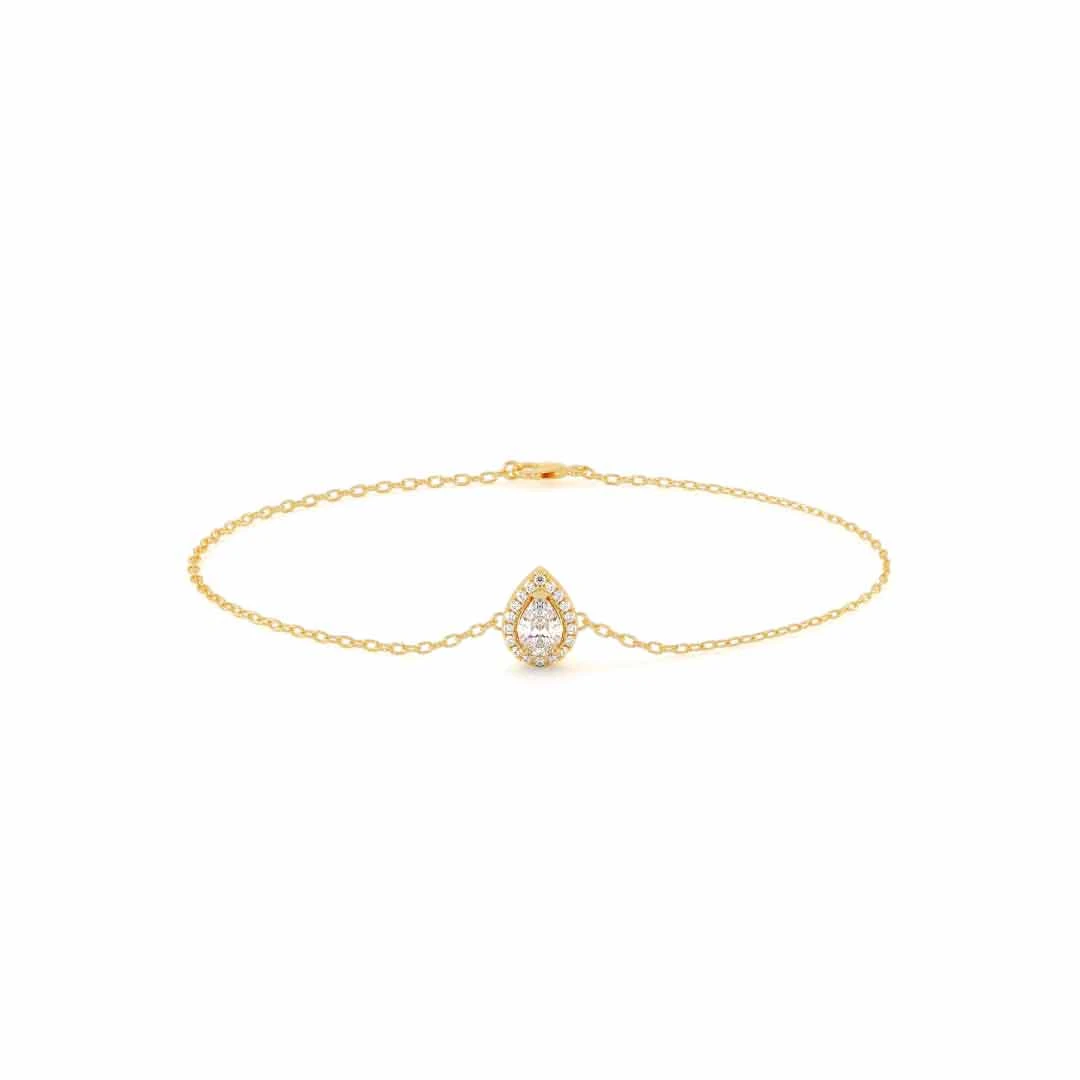 Ce délicat bracelet MAHOGANY en or 18 carats et son diamant de 0,10 à 0,35 carats est magnifié par son halo de petits diamants. Sa pierre centrale taille poire est reliée par une fine chaîne limée
