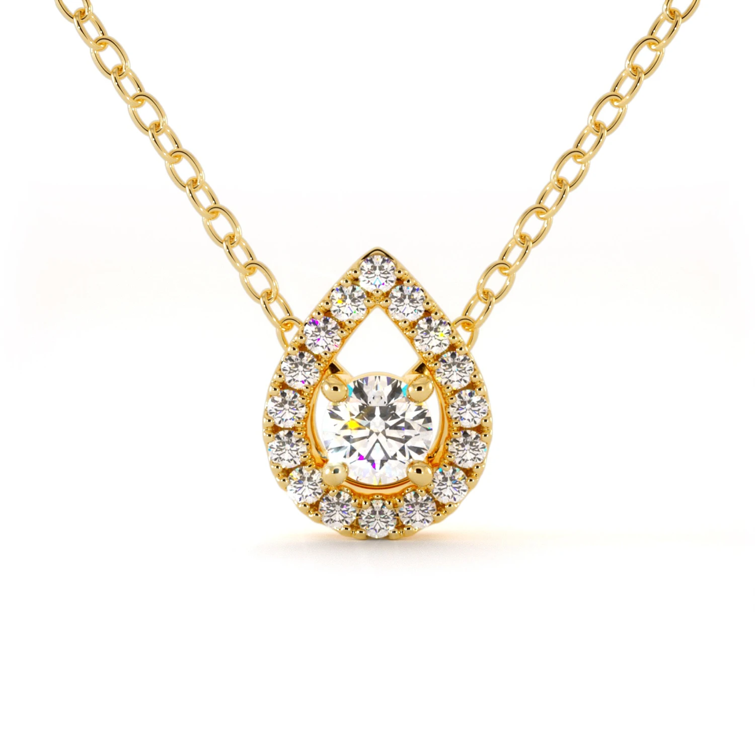 Le collier ASTRÉE marie élégance et sophistication avec un diamant rond de 0.25 Carats entouré d’un halo scintillant en forme de poire. Chaque pierre contribue à un éclat captivant, accentuant la silhouette délicate. Avec une monture exquise, ce collier est bien plus qu’un bijou, c’est une déclaration de grâce intemporelle et de style inoubliable.