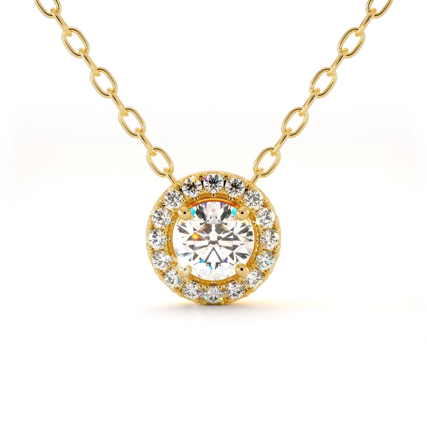 L’élégant collier ELDER en or 18 carats est magnifié par son diamant de 0,20 à 0,30 carats. Son halo de diamants vient rayonner son diamant central taille rond.