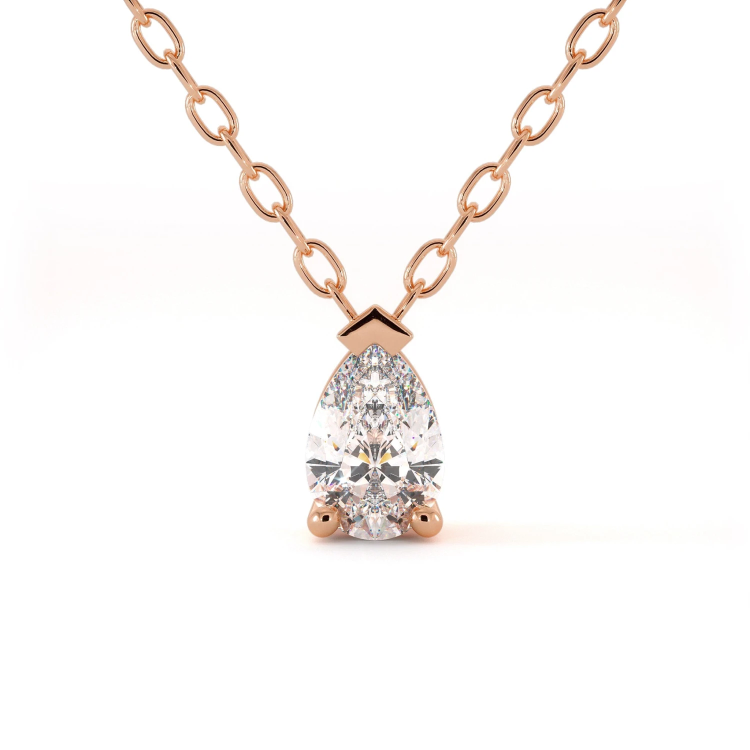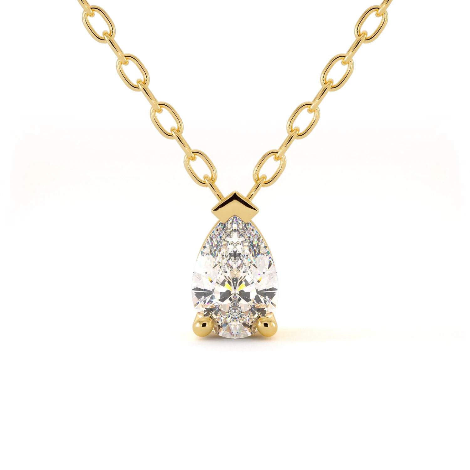 Le collier STAY en or 18 carats et sa pierre centrale en diamant de 0,10 à 0,30 carats, le rend comparable à une goutte de lumière. Cette somptueuse taille poire se glisse dans le creux du cou et scintille.
