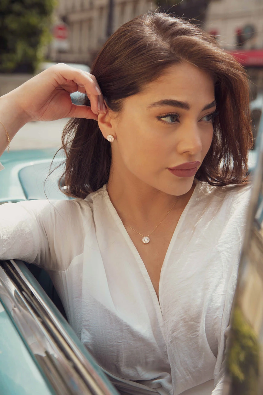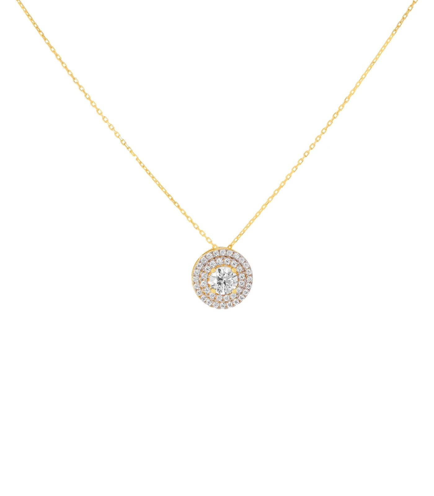 Simple et élégant, le collier XENIA en or 18 carats accompagne les femmes au quotidien. Sur la peau, la pierre centrale scintille tandis qu’un cercle est orné de petites pierres taille brillant pour un effet captivant.