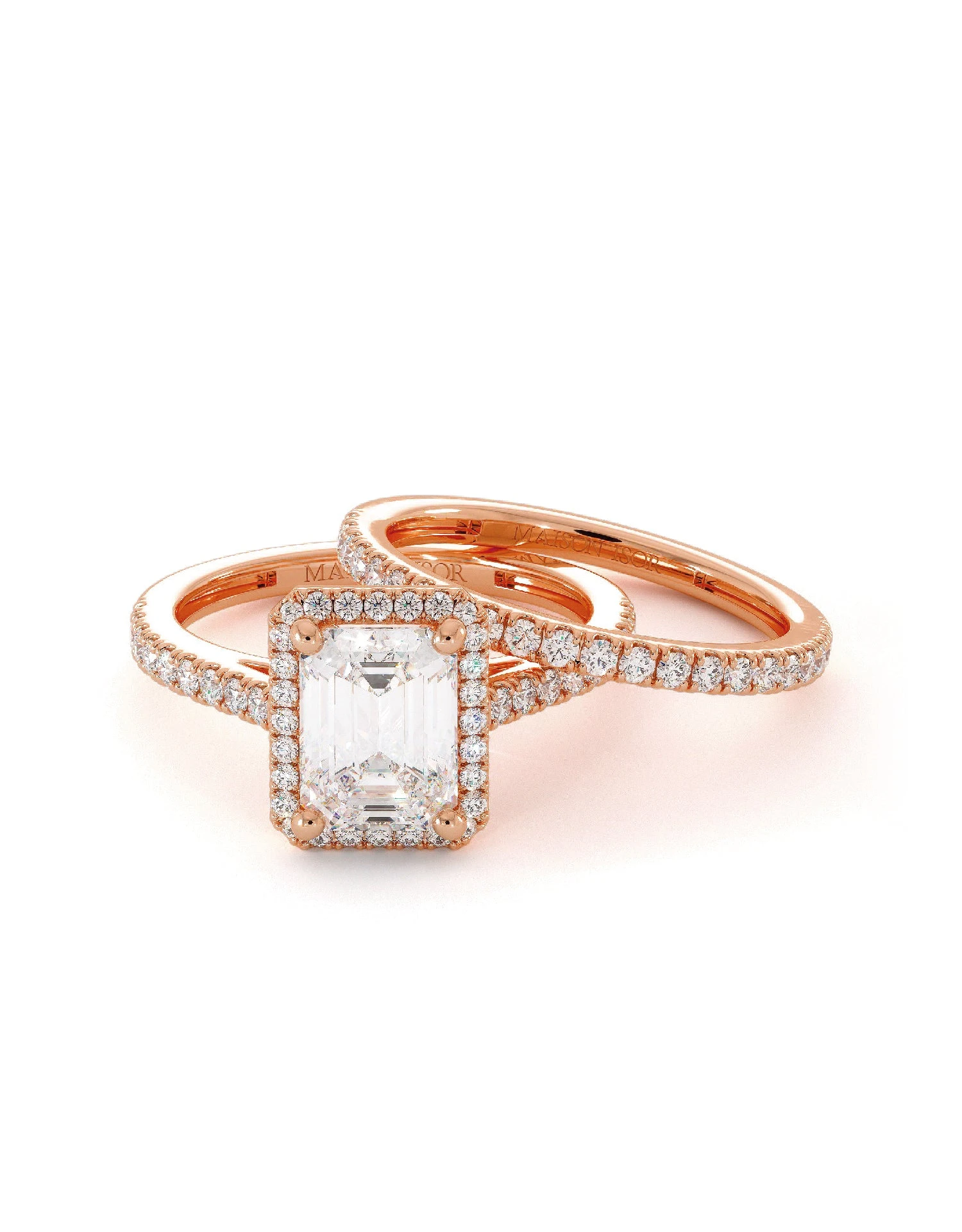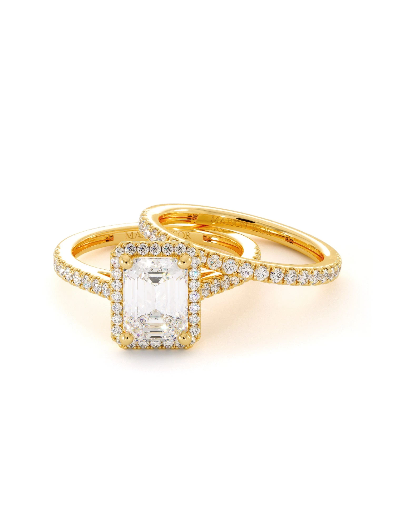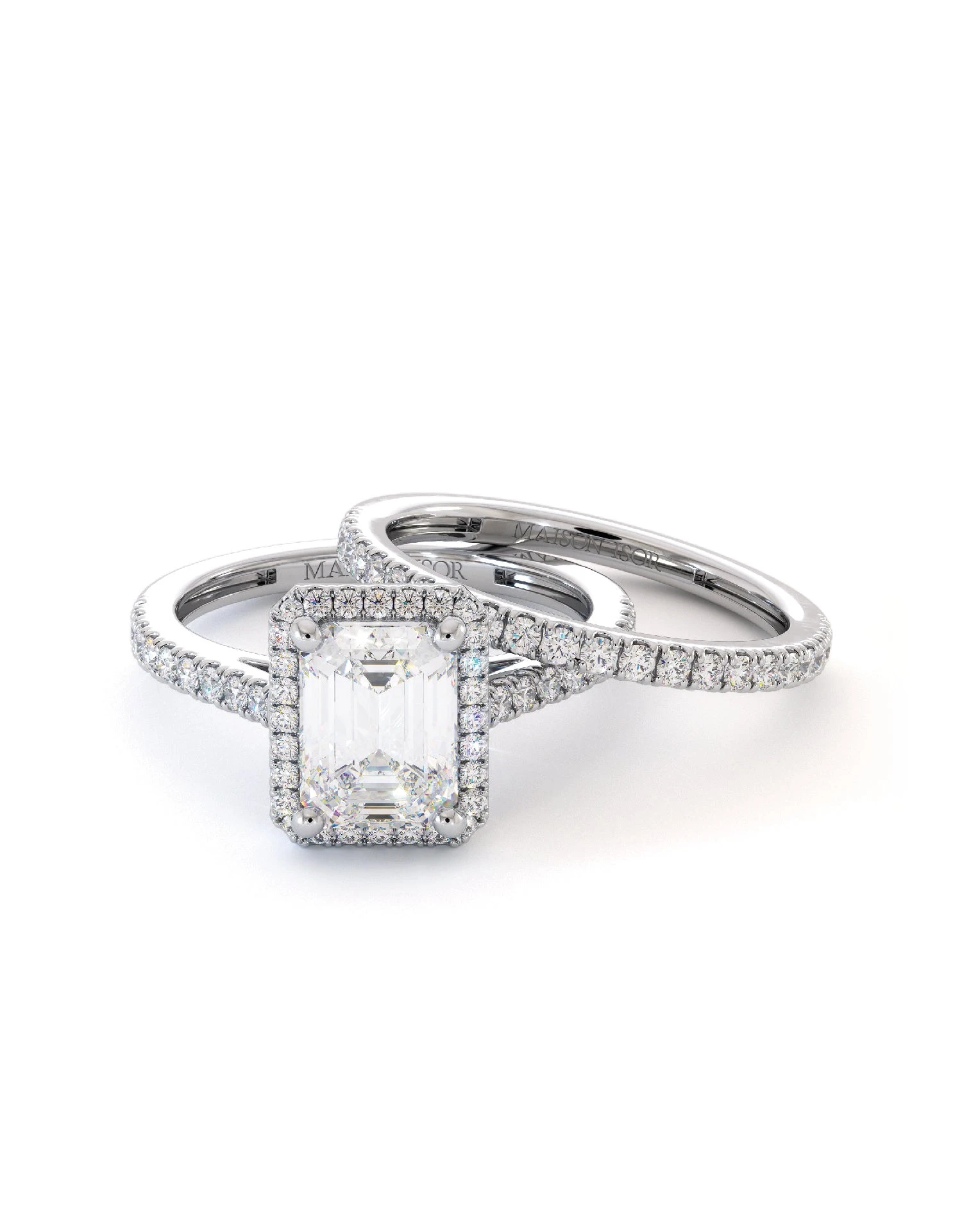 Un magnifique duo en or 18 carats, le modèle AZAEL saura ravir les plus audacieuse d’entre vous. Son solitaire en taille émeraude sertie d’un halo accompagné de sa parfaite alliance ajoute un éclat incomparable au duo.