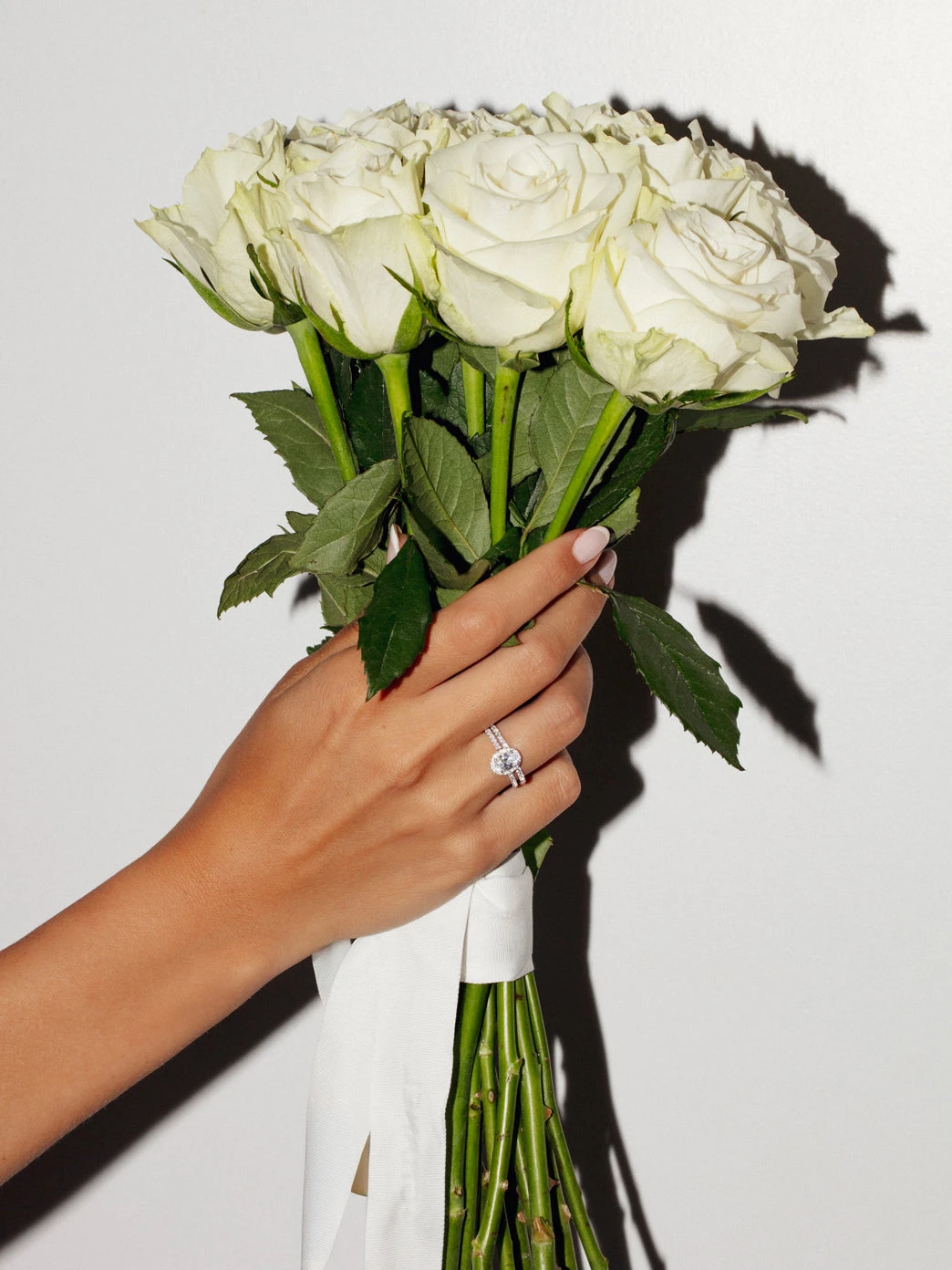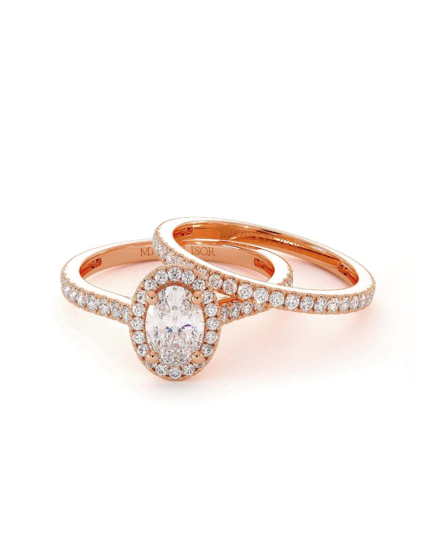 Le duo JUNE en or 18 carats est le choix de l’élégance et de l’intemporalité. La pierre de forme ovale sertie en 4 griffes associée à son halo de pierres en zirconium offre une brillance inégalée au solitaire. La monture pavée de multiples pierres souligne avec éclat la beauté du solitaire. Le modèle est disponible en or blanc, or jaune et or rose.