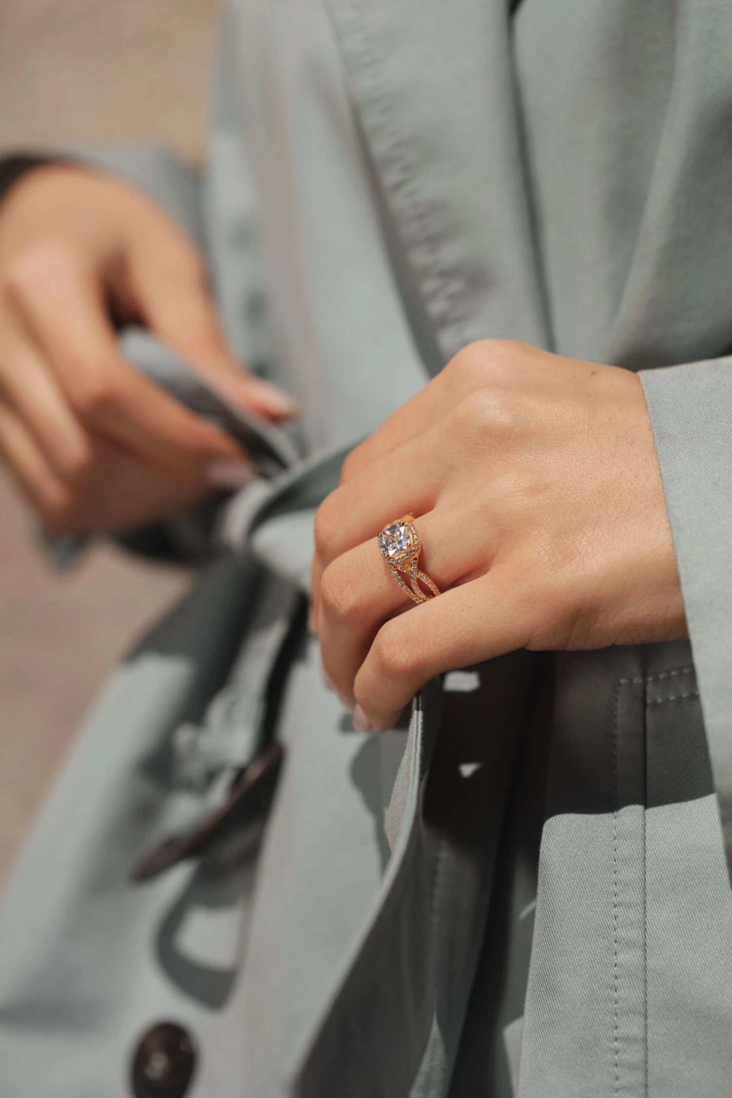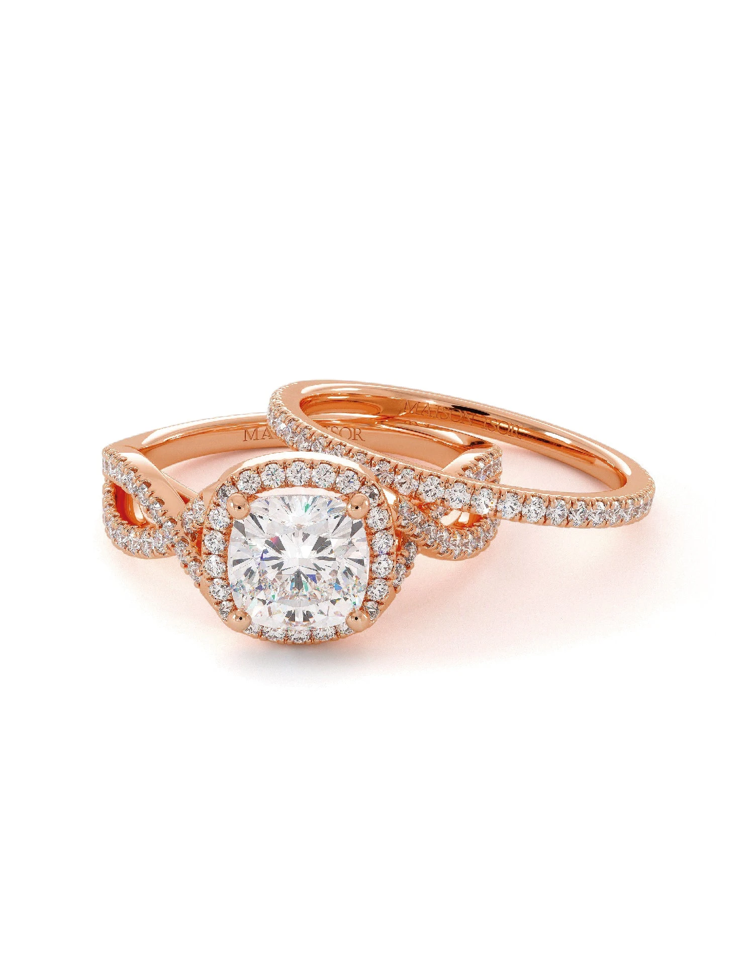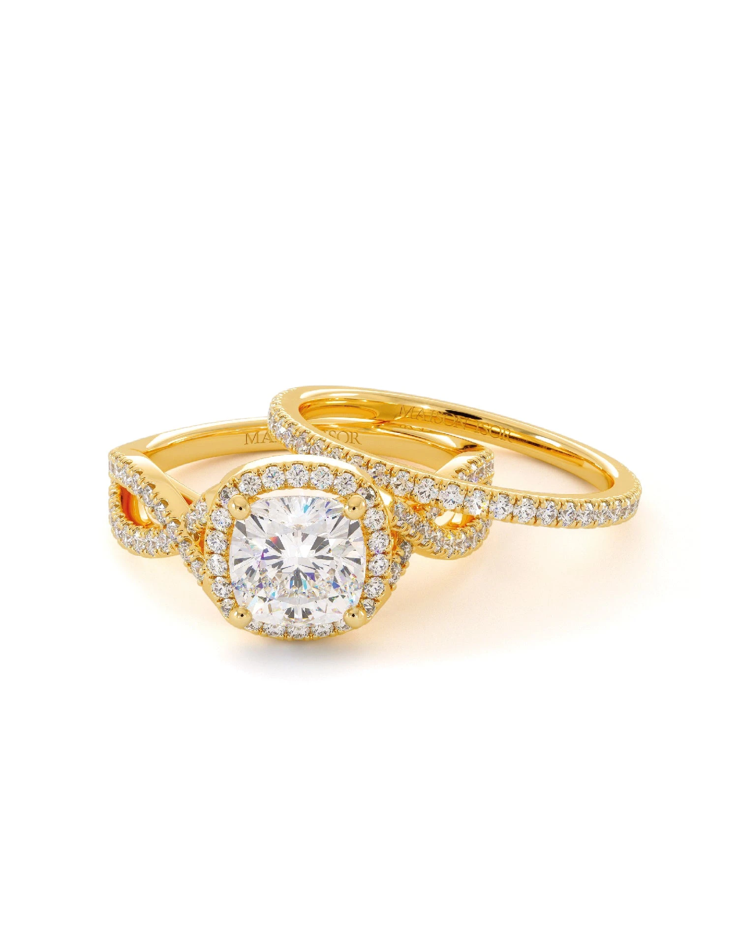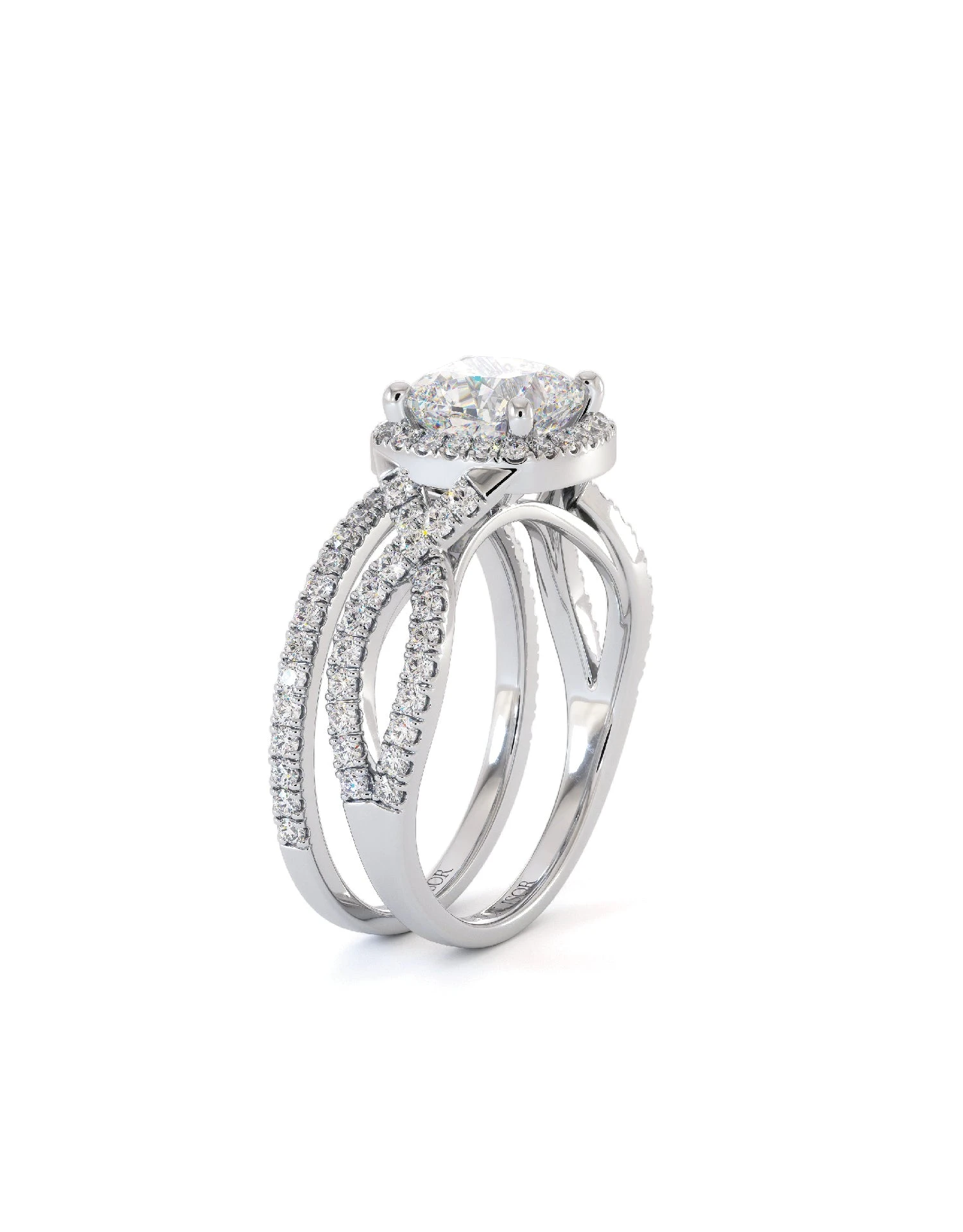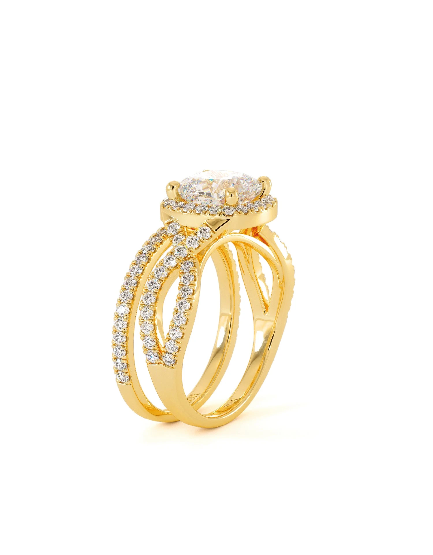 Original et gracieuse le duo RHEA en or 18 Carats se distinguera de part son volume glorieux. Son solitaire au courbe somptueuse arbore une magnifique pierre de taille brillant entouré de son halo qui la rend plus étincelante.