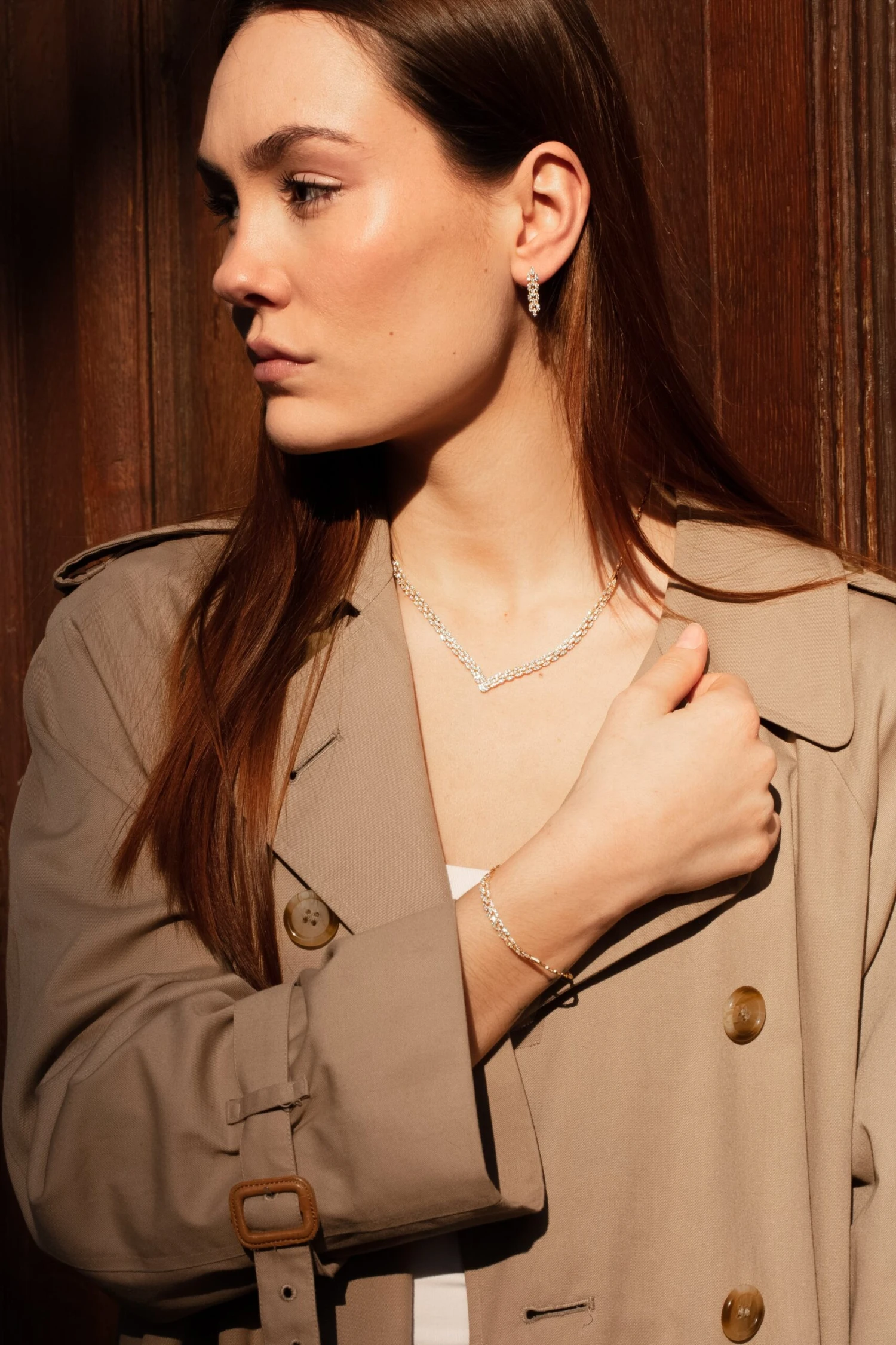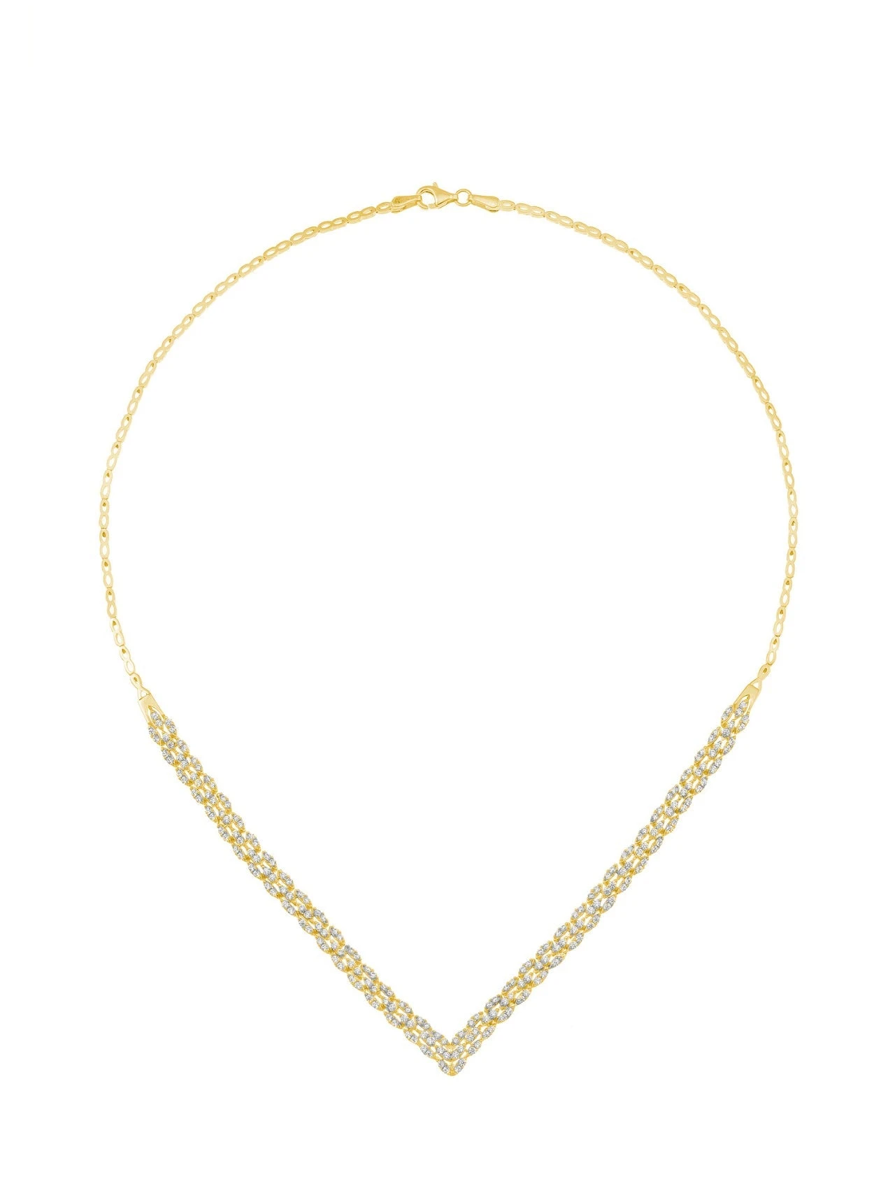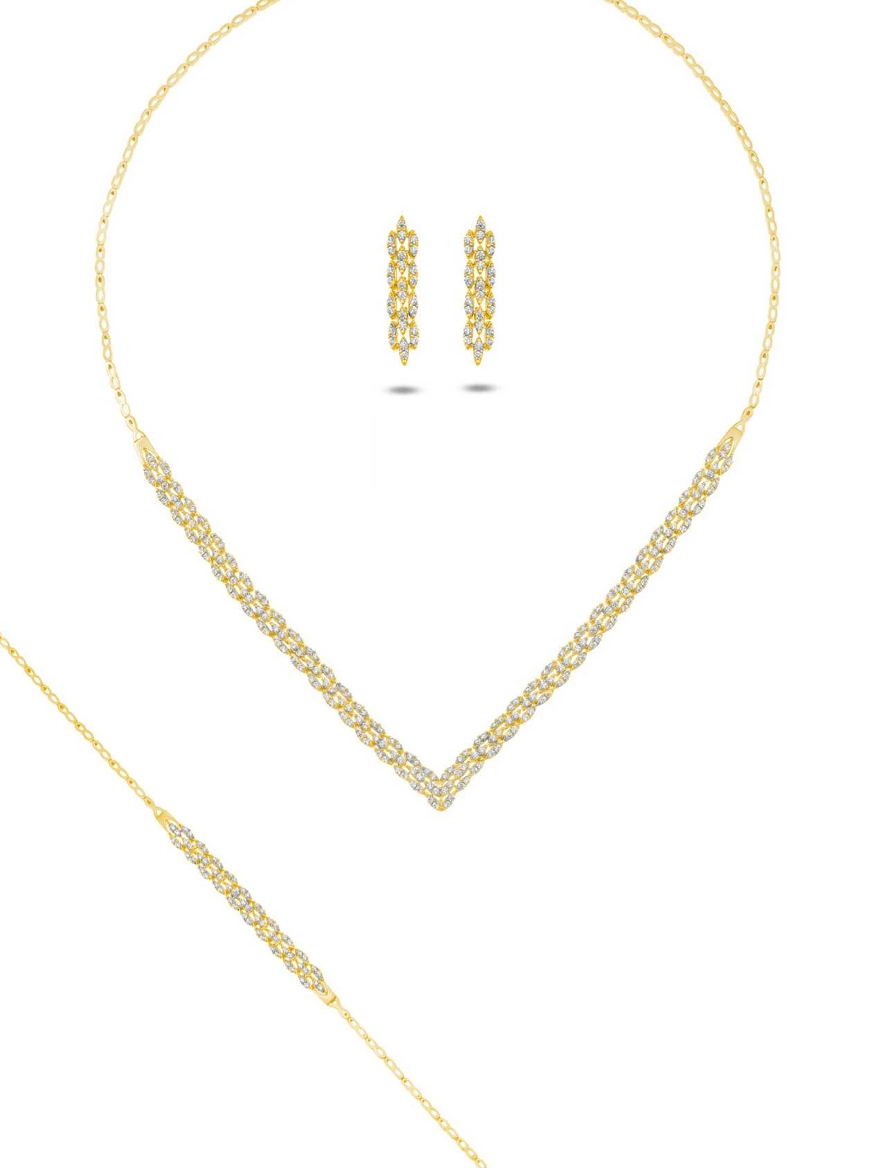L’éclat des oxydes de zirconium rencontre la magie de l’or 18 carats, avec cette parure composée d’un collier, d’une gourmette, et d’une paire de boucle d’oreille.