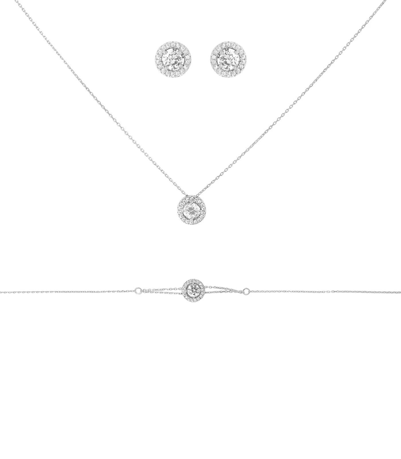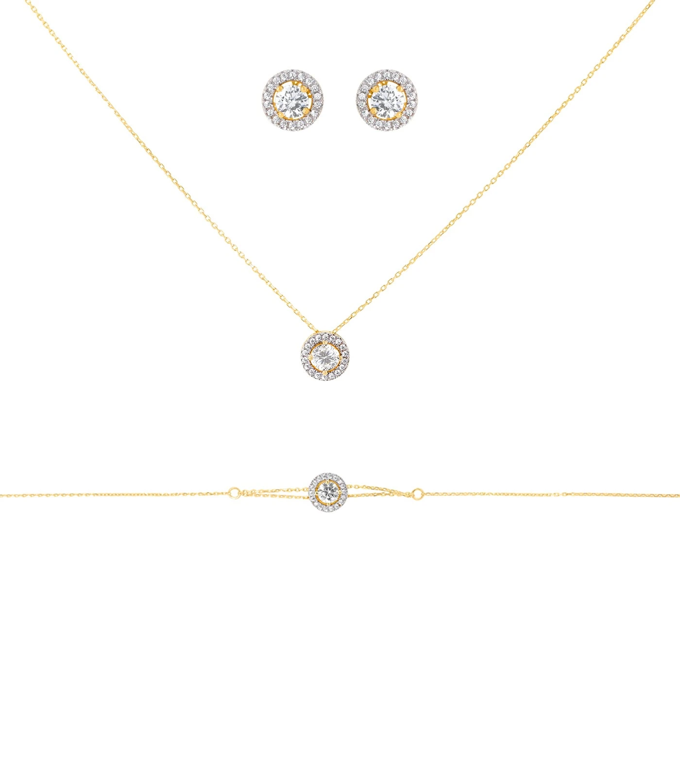 Composé d’un collier, d’une paire de boucle d’oreille et d’une gourmette, notre parure de bijoux AIRI en or 18 carats incarne la beauté intemporelle. Raffiné et délicate, le motif circulaire orné de petites pierres en zirconium contient en son centre une pierre de forme ronde taillée “signity” pour une belle brillance.