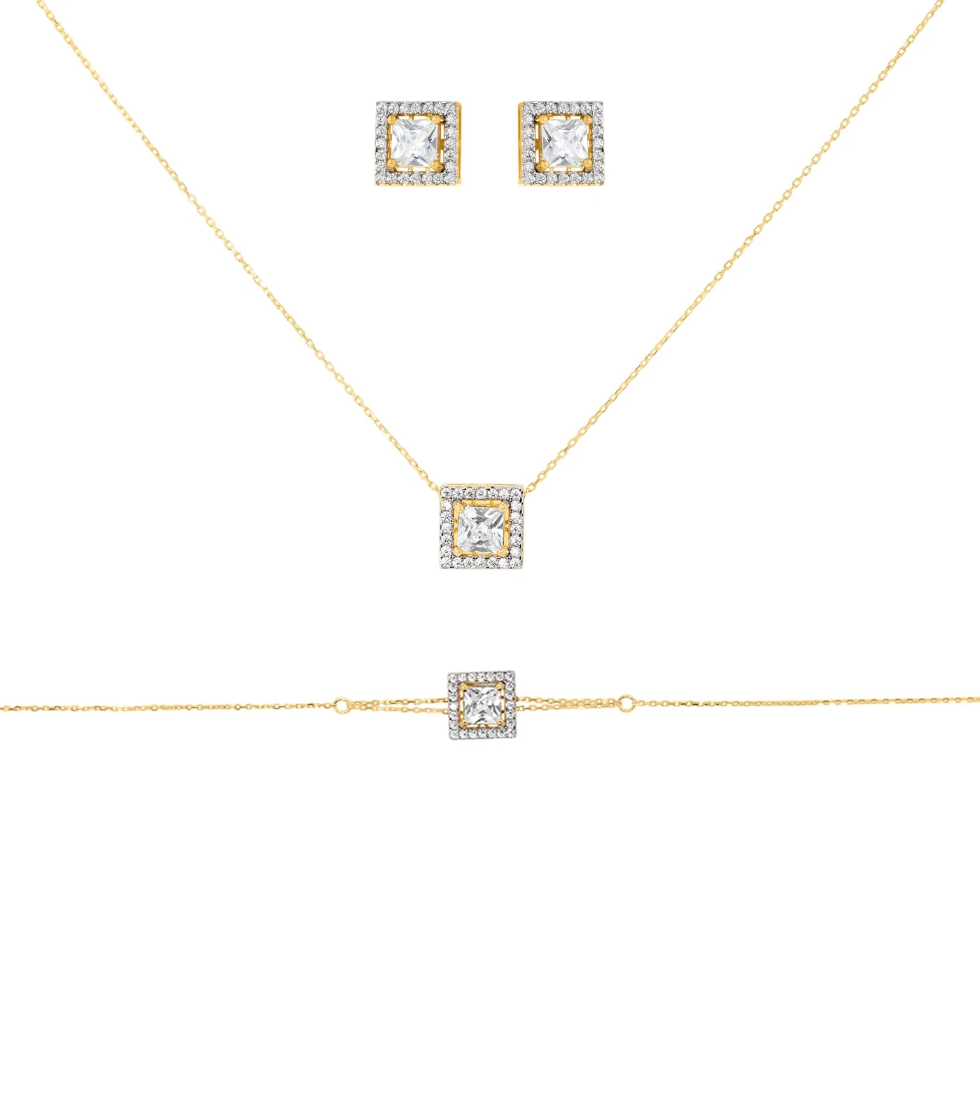 Le mini set AKIRA en or jaune 18 carats est intemporel et élégant. Sa pierre centrale taille princesse est idéal en toute occasion et essentiel à toute collection de bijoux. Ce mini set est composé d’un collier, d’une paire de boucle d’oreille et d’une gourmette.