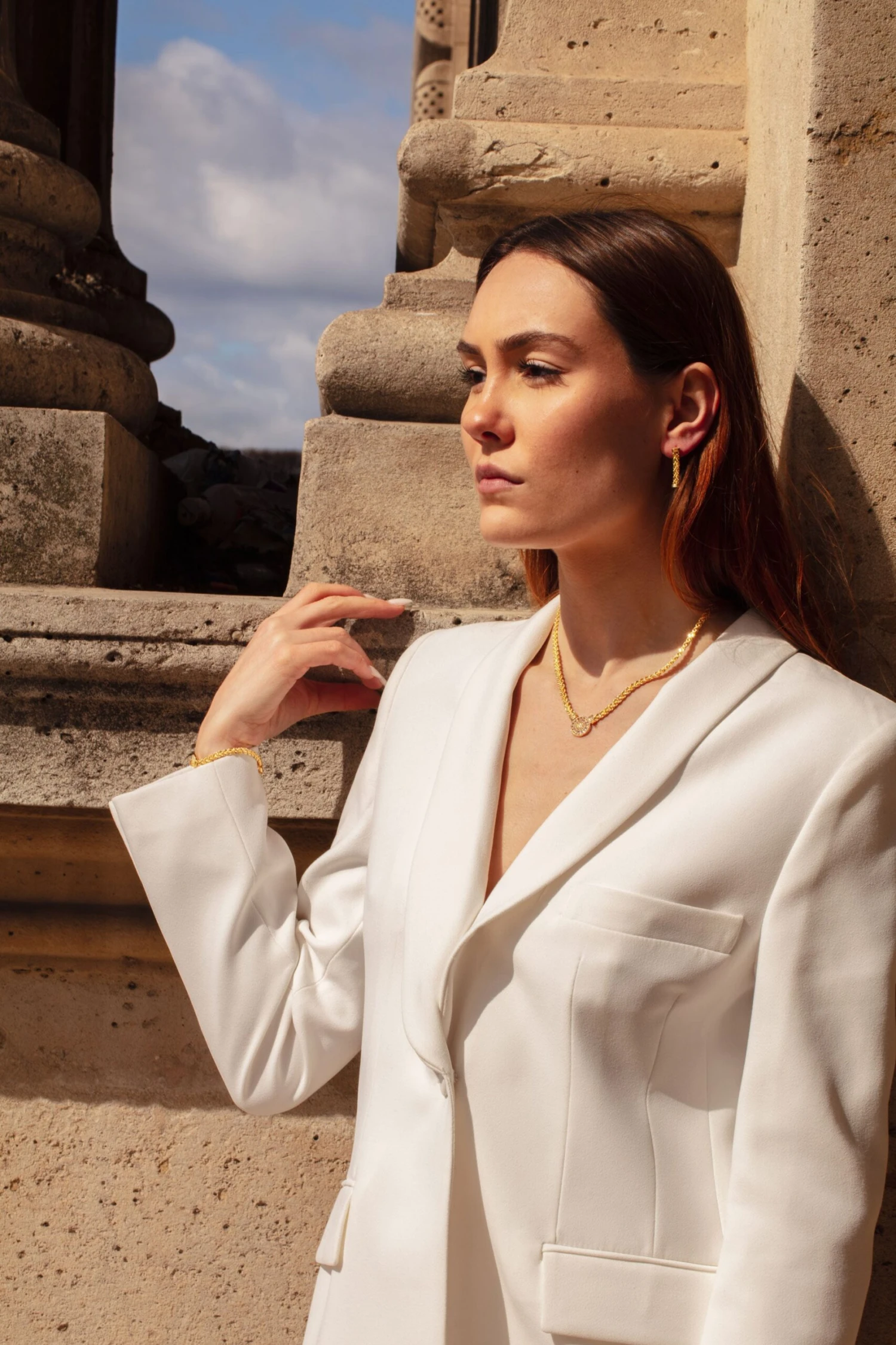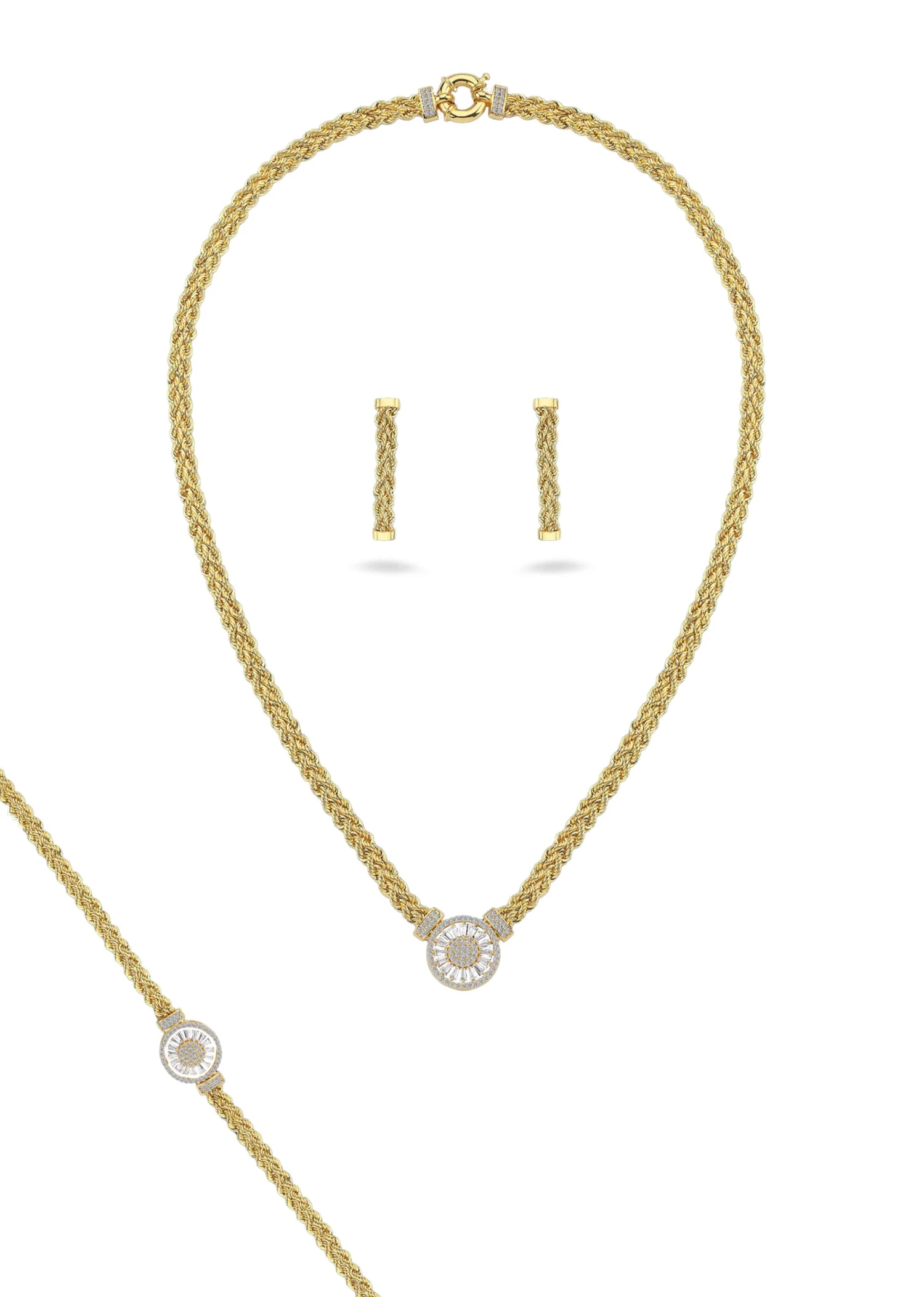 La parure BAIA en or 18 carats est la création idéale pour vous mettre en valeur. Tout en mouvement, les lignes de mailles s’enlacent entre elles pour sublimer le motif central solaire. Subtil et raffiné, le cercle scintillant apporte une délicatesse sans pareil à la parure. Elle se compose de 3 pièces ; un collier, un bracelet et une paire de boucles d’oreille.