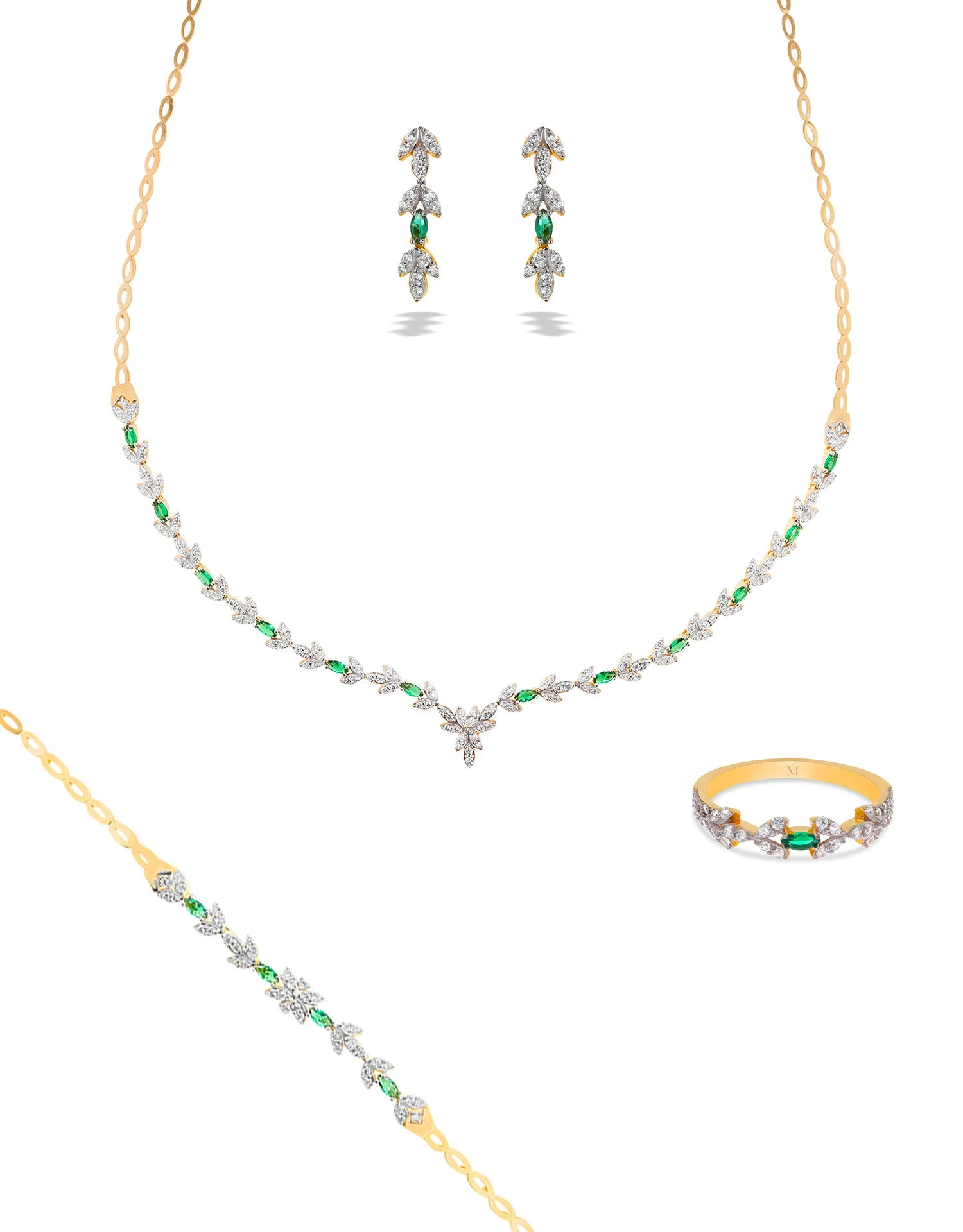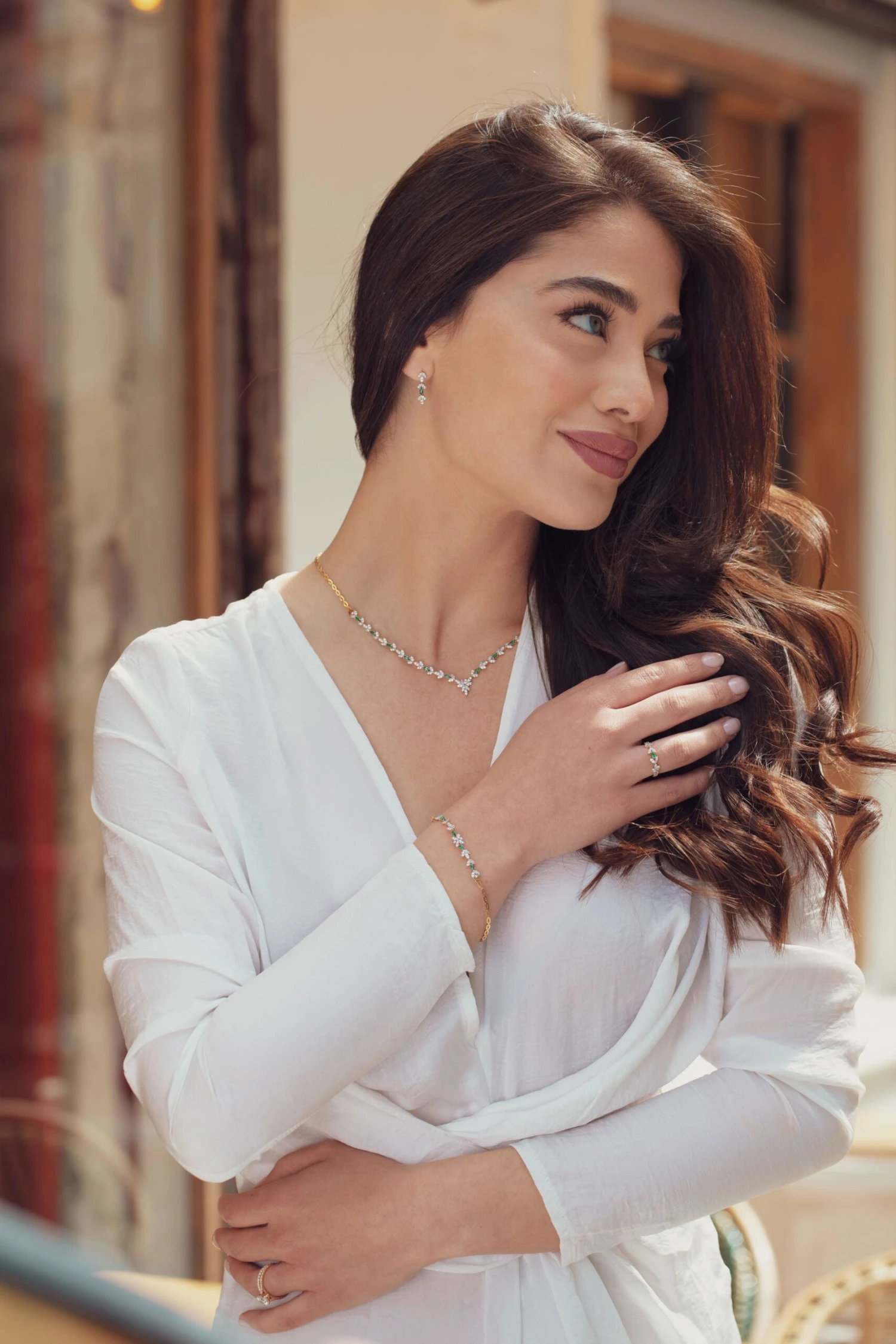 Symbole de la royauté, la parure en or 18 carats DAISY, inspiré de la fleur de lys, vous fera voyager à travers le temps. Le design de cette parure s’inspire de cette illustre symbole. Sa pièce maitresse un collier orné de magnifiques marquises en oxyde bleu et de brillant formant les pétales de fleurs. Une gourmette, une bague et une paire de boucle d’oreille feront écho afin de complété cette parure.