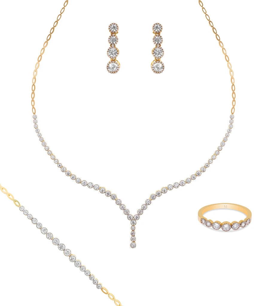 De style vintage la parure en or 18 carats HAZEL vous rendra irrésistible. Ces pierres en oxyde de zirconium serti dans un délicat perlé vous promettrons une lumière infinie. HAZEL se compose de quatre pièces un collier pendent, une gourmette, une bague ainsi qu’une paire de boucle d’oreille.
