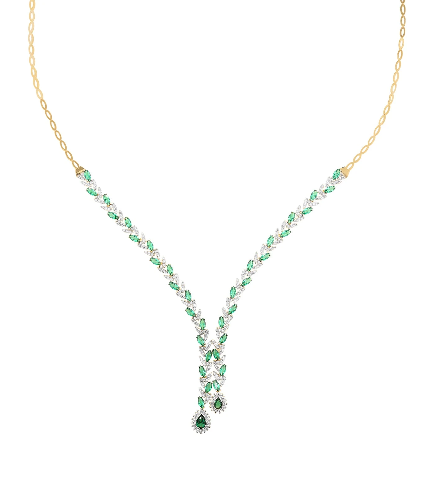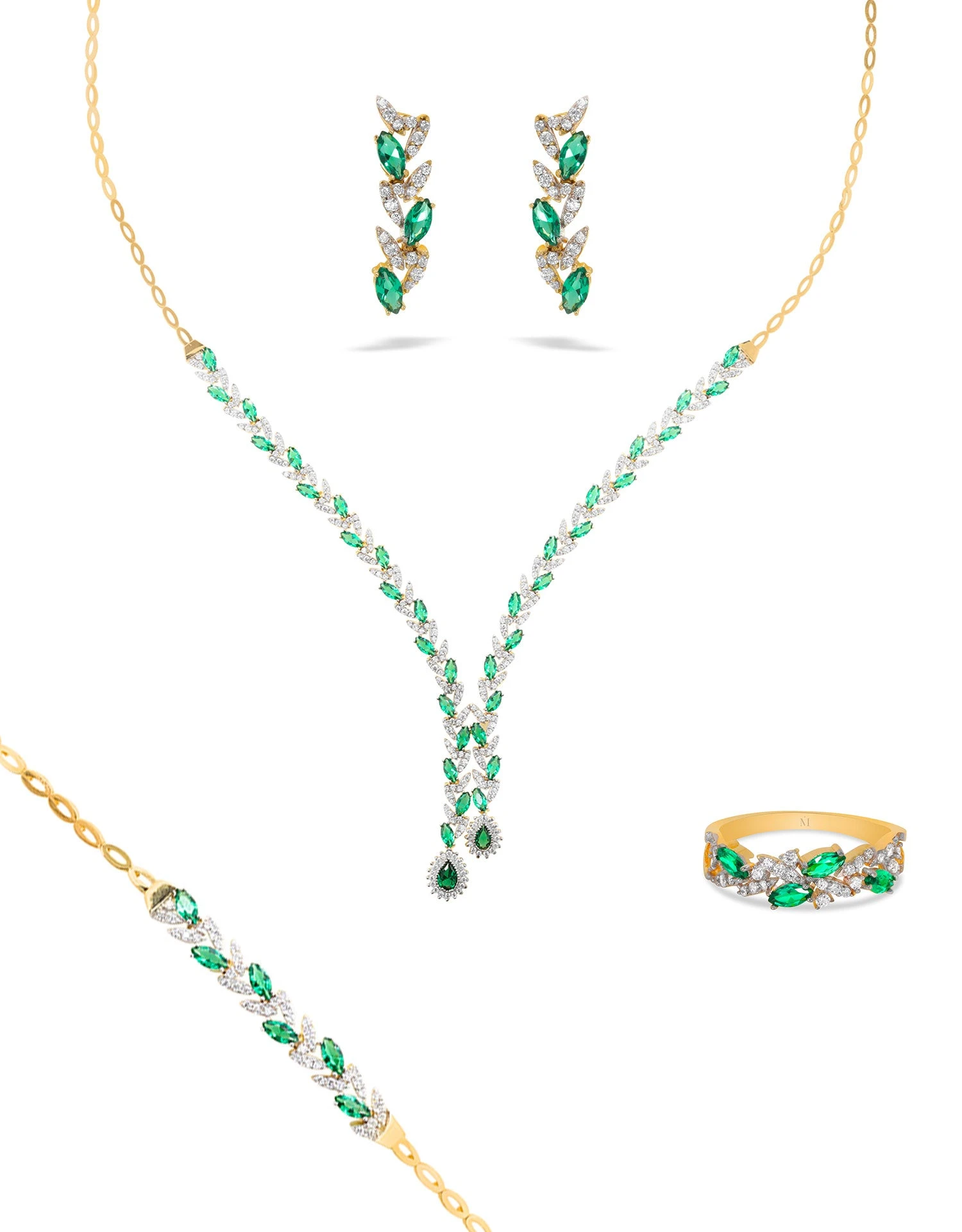 Cette sublime parure en or 18 carats issue de notre collection vous impressionneras par son charme unique. Elle comprend un collier orné de marquise en oxyde de zirconium vertes ainsi que deux magnifique poire à son bout, une gracieuse paire de boucle d’oreille, une bague et une gourmette créant un look sophistiqué parfait pour rehaussé votre style.