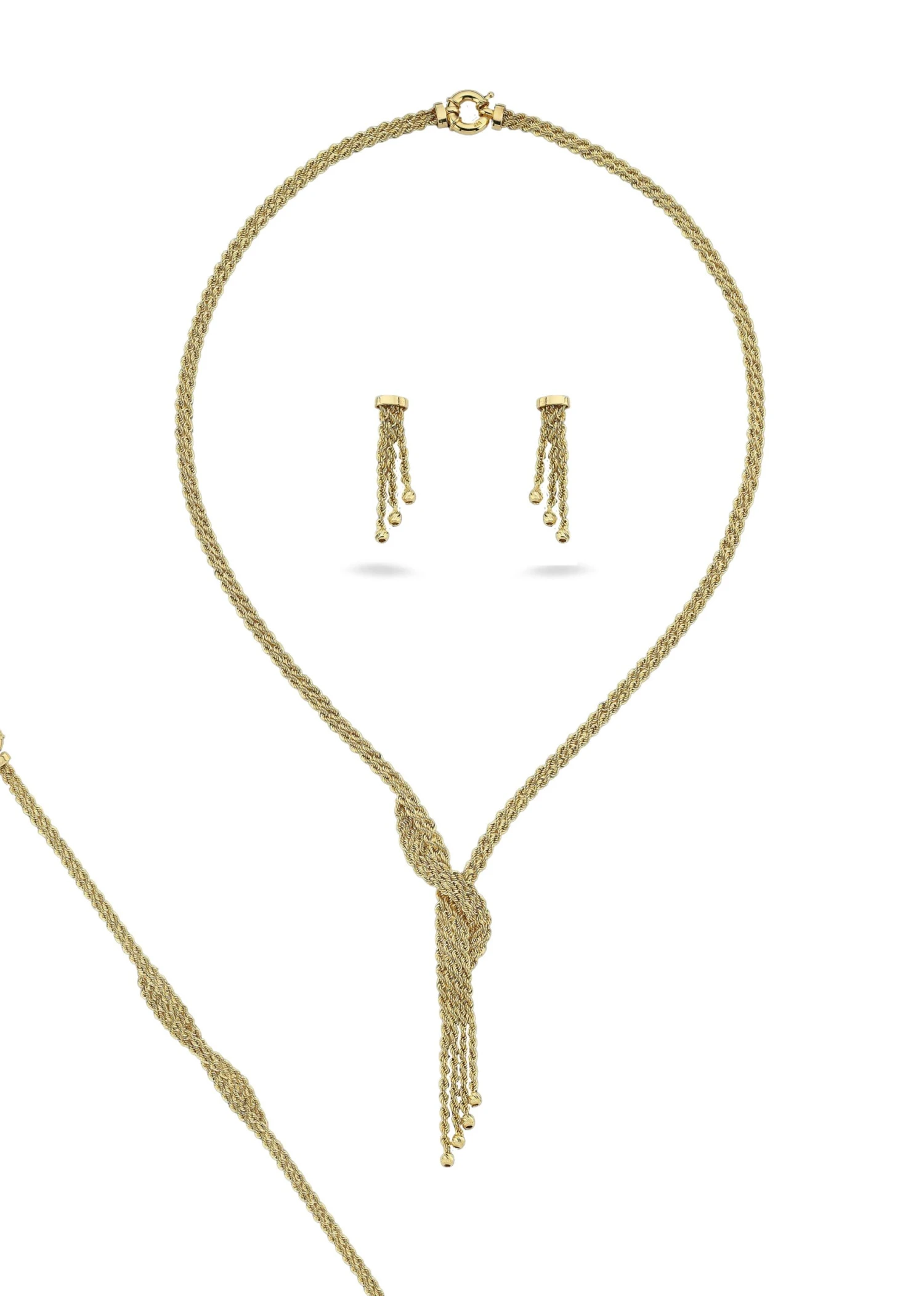 L’élégante parure NANCY composée d’un collier à nœud central et pampilles, assortie d’un bracelet et de boucles d’oreilles pendantes. Un design raffiné pour sublimer vos tenues de soirée.