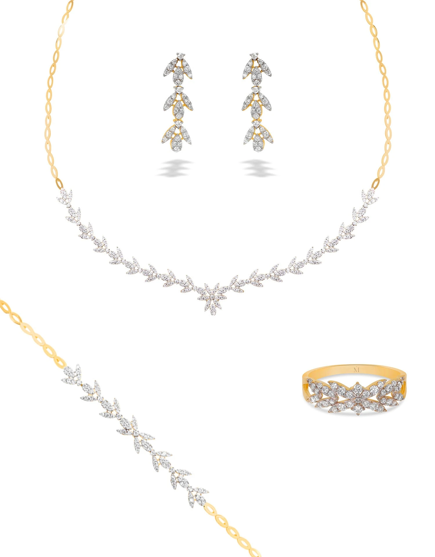 Noble et symbole d’éternité durant l’Antiquité, la parure RAISA en or 18 carats s’inspire du laurier. Composée de 4 pièces ; d’un collier, d’une gourmette, d’une bague et d’une paire de boucle d’oreille, cette parure élégante et gracieuse ne se démodera jamais.