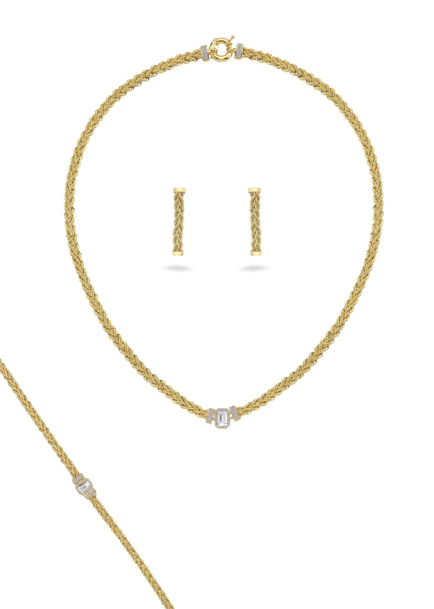 Subtil et raffinée, la parure SAORI est une création de toute élégance mariant la maille dorée et les pierres scintillantes. Elle se compose de 3 pièces en or 18 carats; un collier, une gourmette et une paire de boucles d’oreille. La maille s’habille délicatement de bandes brillantes et d’une belle pierre centrale.