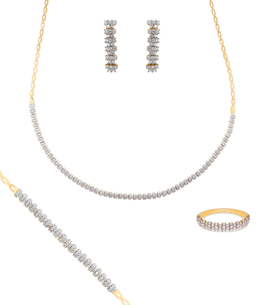 Délicate et épurée, cette parure en or 18 carats est composé d’un collier en forme de V, d’une gourmette, d’une bague, et de boucle d’oreille pendante ornée d’oxyde de zirconium. Parfaite pour être porté quotidiennement ou lors de grande occasions, ZAHARA vous rendra irrésistible.