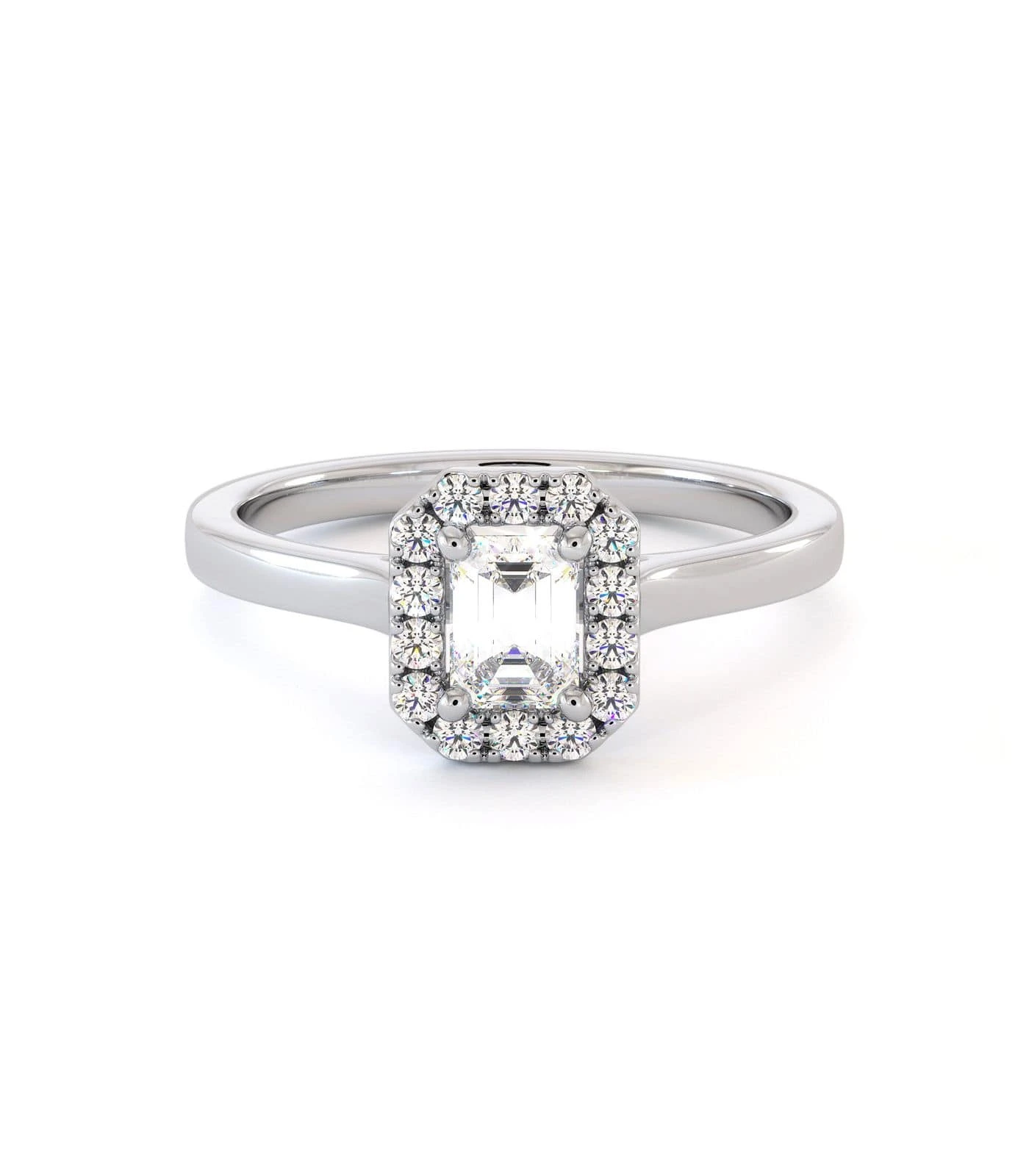 Solitaire Abuja en or 750/1000, orné d’un diamant central taille émeraude entouré d’un halo de diamants éclatants.