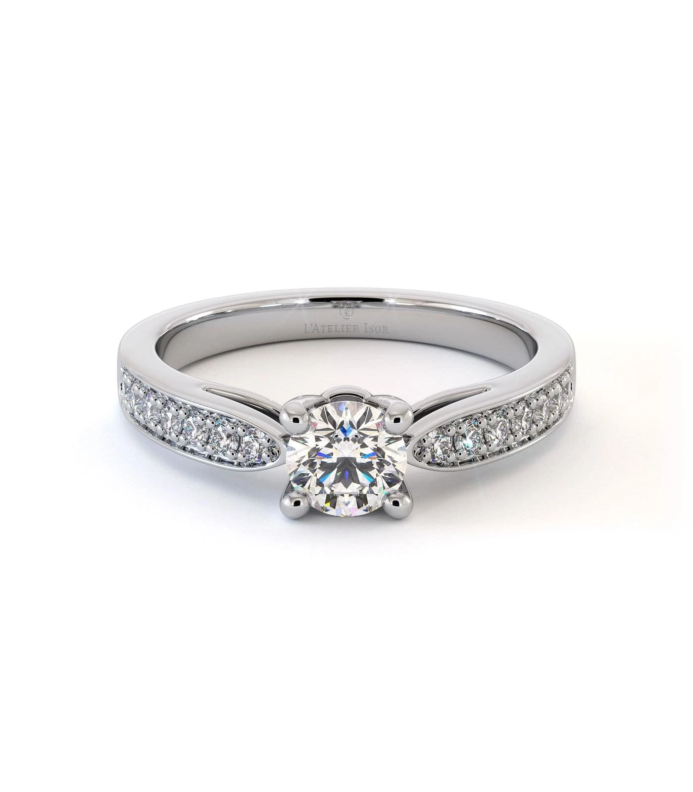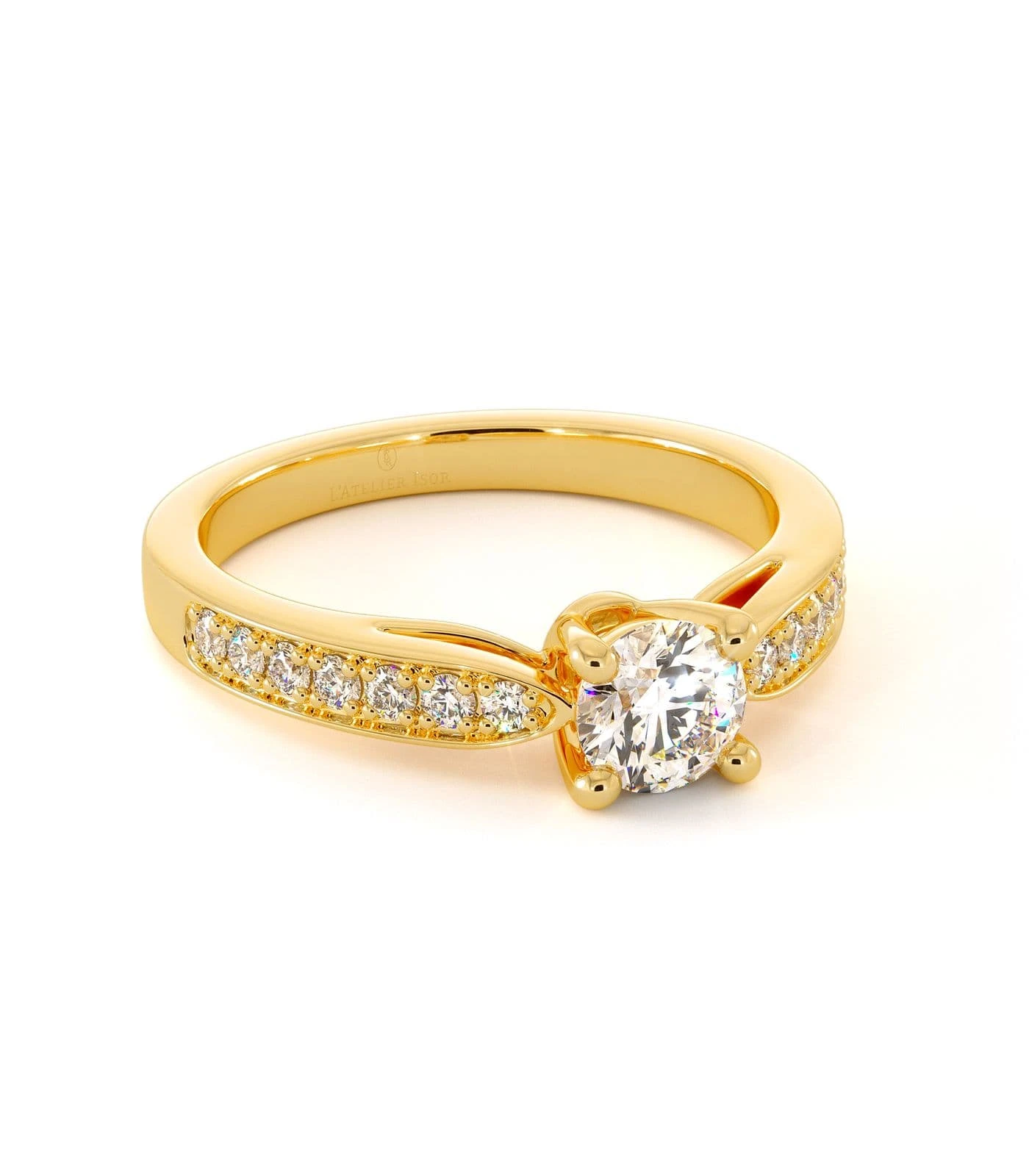 Symbole d’amour éternel, la bague de fiançailles AULIA en or 18 carats est sertie d’un éclatant diamant central de 0.45 carats taille brillant et pavé de diamants apportant une lumière des plus rayonnantes qui saura vous accompagner toute une vie. Au design à la fois classique et intemporel, le solitaire AULIA sublimera parfaitement la main d’une femme romantique et délicate. Comme tous nos bijoux en or et diamant, vous pouvez acquérir ce précieux modèle en or rose, en or jaune et en or blanc. Le solitaire AULIA s’associe parfaitement avec la splendide alliance DUNE. Vous pouvez aussi vous laisser tenter par une alliance sur-mesure rien que pour vous qui saura épouser parfaitement le corps de cette bague.
