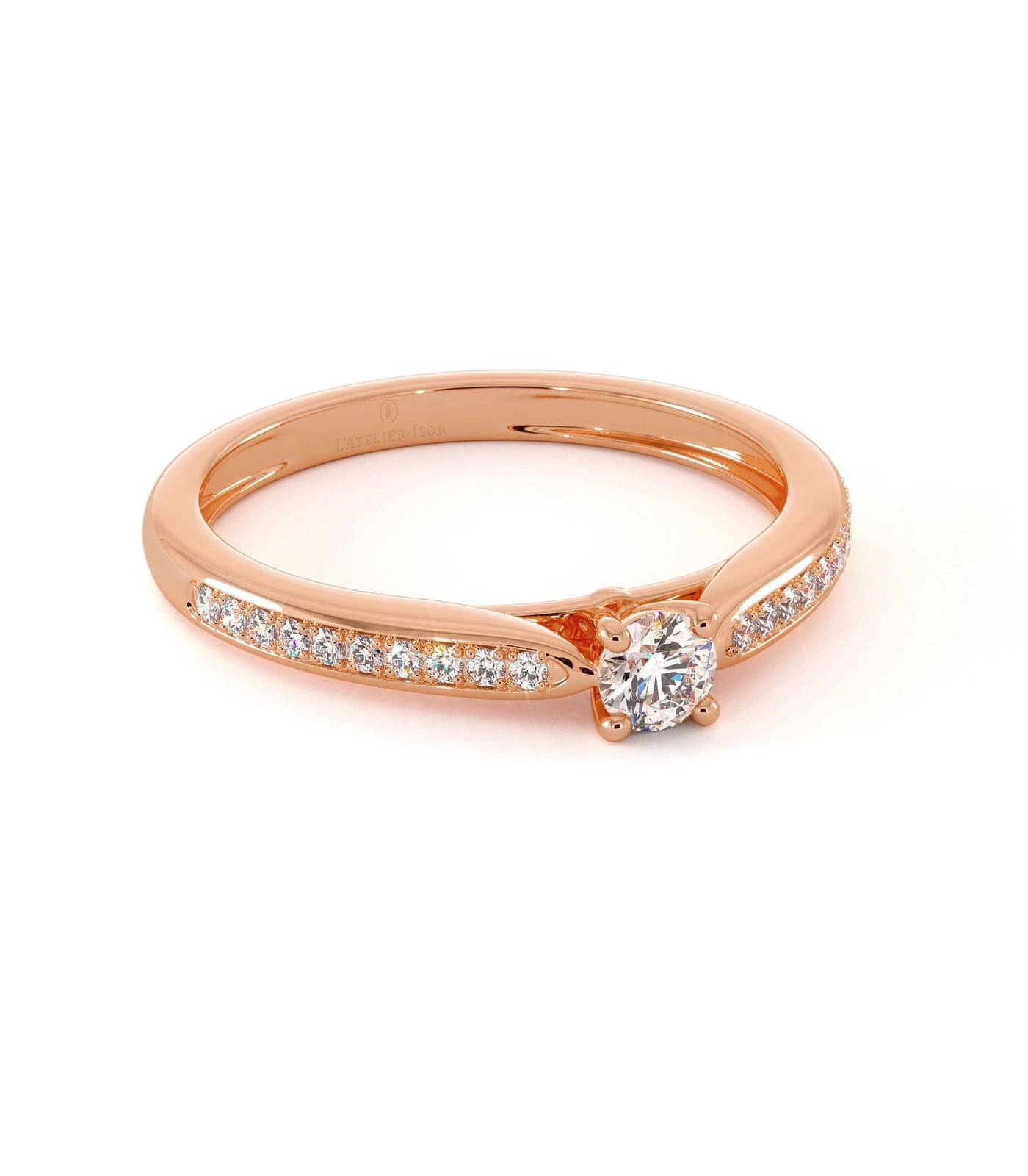 Le design gracieux du solitaire CAPPELE en or 18 carats éveillera toutes vos rêveries. Sa sobriété et sa discrétion se révèlent par un diamant taille brillant accompagné par des petits diamants longeant le corps de l’anneau apportant un éclat flamboyant. Par son élégance et sa finesse étincelante, la bague de fiançailles CAPPELE sublimera la main d’une femme romantique et raffinée. Ce solitaire captivant peut être porté seul ou parfaitement complété avec l’alliance JOY. Vous pouvez également créer votre propre alliance qui épousera parfaitement le corps de cette bague, en profitant de notre service de création sur-mesure.