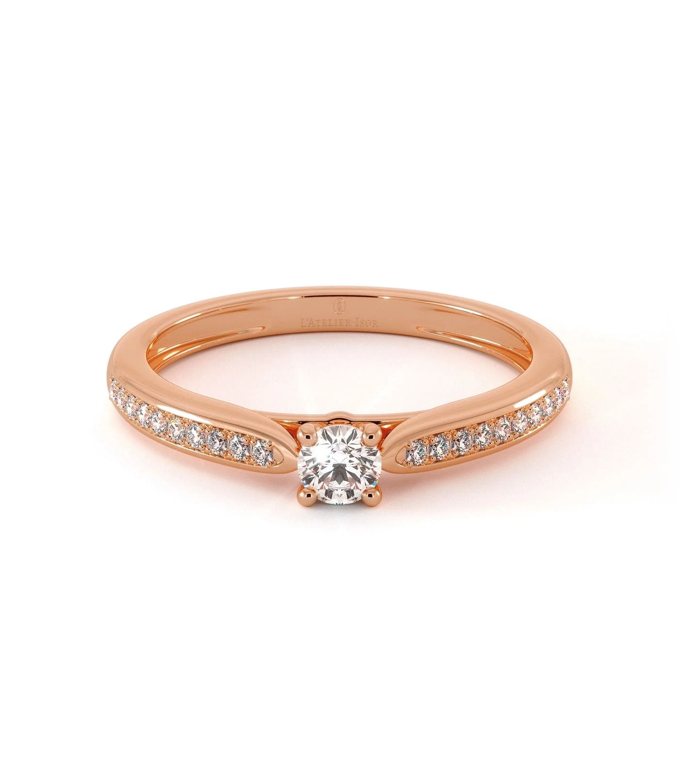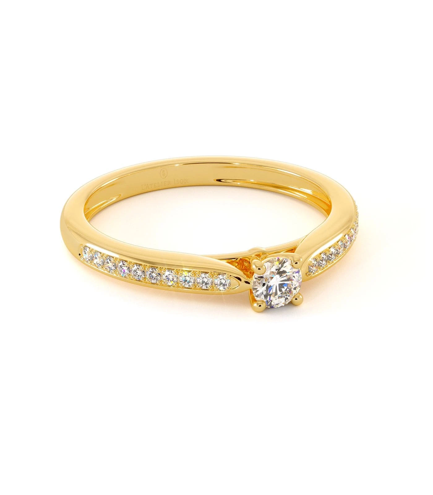 Le design gracieux du solitaire CAPPELE en or 18 carats éveillera toutes vos rêveries. Sa sobriété et sa discrétion se révèlent par un diamant taille brillant accompagné par des petits diamants longeant le corps de l’anneau apportant un éclat flamboyant. Par son élégance et sa finesse étincelante, la bague de fiançailles CAPPELE sublimera la main d’une femme romantique et raffinée. Ce solitaire captivant peut être porté seul ou parfaitement complété avec l’alliance JOY. Vous pouvez également créer votre propre alliance qui épousera parfaitement le corps de cette bague, en profitant de notre service de création sur-mesure.