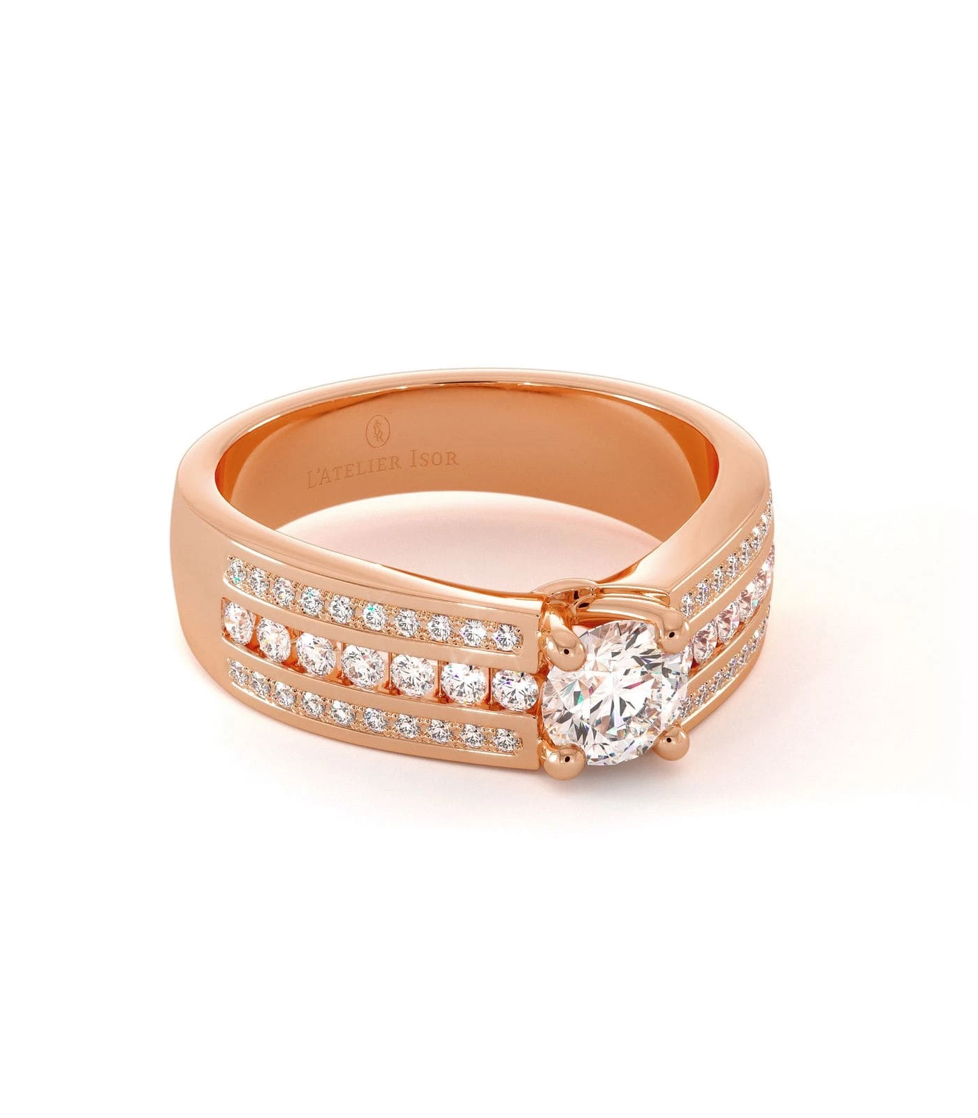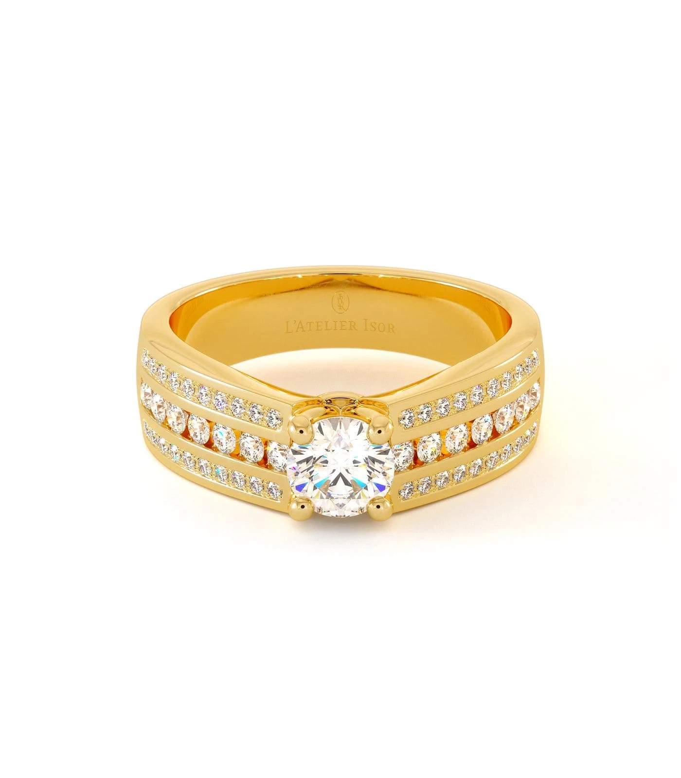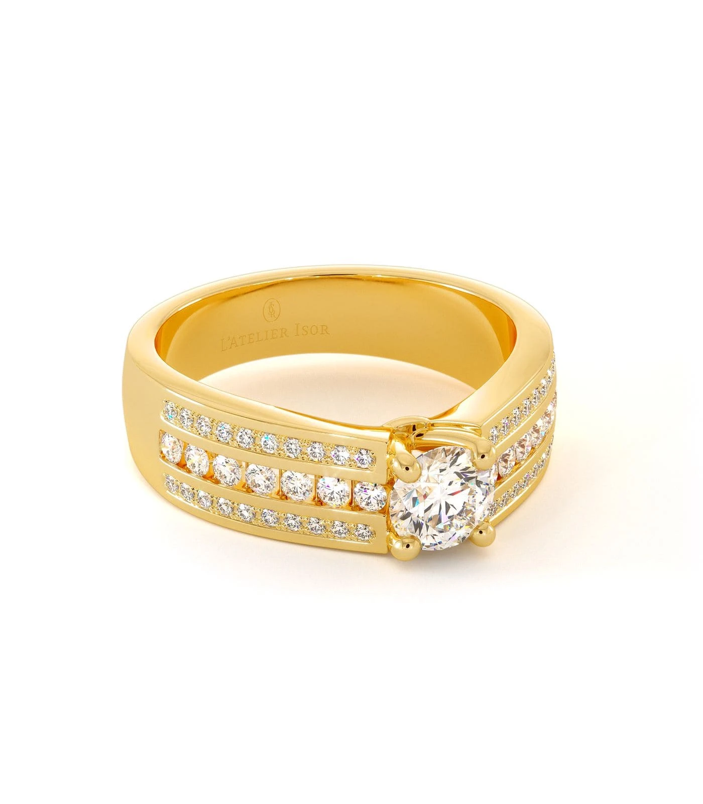 La bague de fiançailles CASSIS en or 18 carats est sertie d’un éclatant diamant central taille brillant. Une bague épatante par sa présence et par sa brillance étincelante accompagnée d’un riche pavage incrusté d’une multitude de petits diamants. Cette association de lumières donne au modèle CASSIS un caractère séduisant et original. Le voluptueux solitaire éblouit par sa présence imposante caractérisée par son style audacieux qui sublimera divinement la main d’une femme créative et originale. Une monture qui apportera à votre doigt un effet bandeau, une épaisseur qui habillera votre main d’or et d’étoiles.