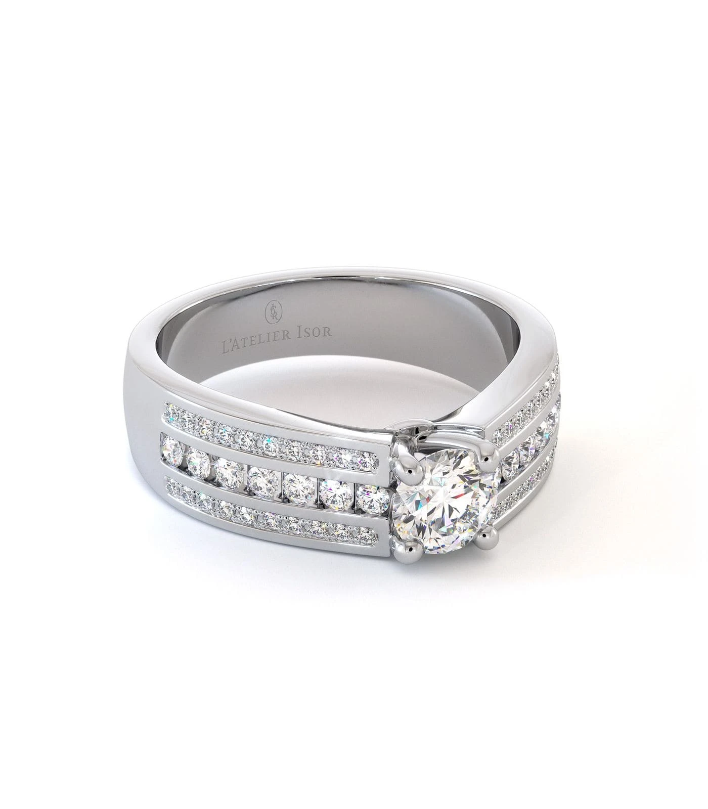 La bague de fiançailles CASSIS en or 18 carats est sertie d’un éclatant diamant central taille brillant. Une bague épatante par sa présence et par sa brillance étincelante accompagnée d’un riche pavage incrusté d’une multitude de petits diamants. Cette association de lumières donne au modèle CASSIS un caractère séduisant et original. Le voluptueux solitaire éblouit par sa présence imposante caractérisée par son style audacieux qui sublimera divinement la main d’une femme créative et originale. Une monture qui apportera à votre doigt un effet bandeau, une épaisseur qui habillera votre main d’or et d’étoiles.