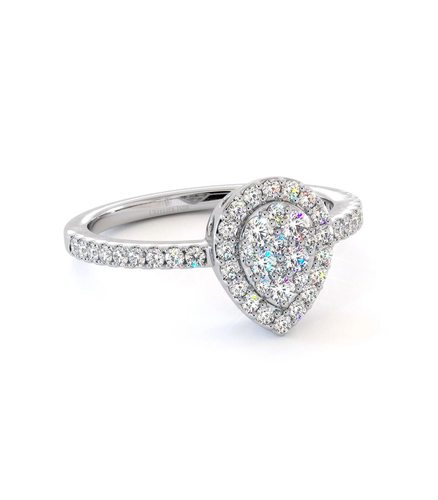 Solitaire Edo en or 750/1000, serti de diamants formant l’illusion d’une pierre centrale taille poire à l’éclat intense. S’accorde avec l’alliance Makian.