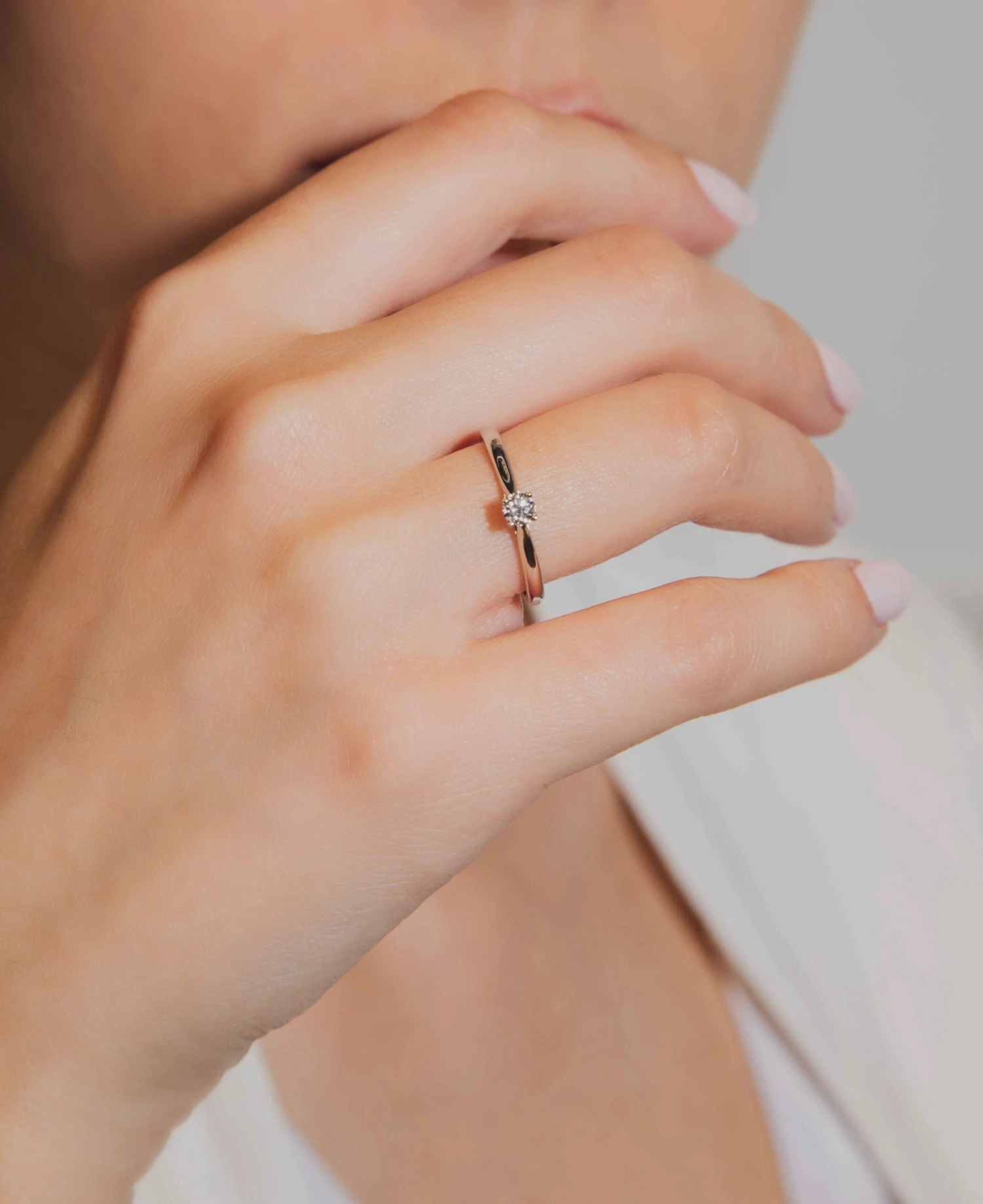 Le solitaire ESSIA en or 18 carats est destiné à toutes les femmes au style intemporel et sobre. Cette magnifique bague de fiançailles mise sur la simplicité et le raffinement des lignes pures de son anneau. Le modèle ESSIA met sur le devant de la scène un sublime diamant qui apportera un scintillement divin à votre doigt. Pour compléter ce solitaire, optez pour l’alliance PALMYRE qui ne fera que révéler l’éclat de votre diamant, ou créer votre bague de mariage sur-mesure qui accompagnera à merveille ce solitaire. Le modèle ESSIA est réalisable avec un diamant de 0.10 à 0.85 carats.
