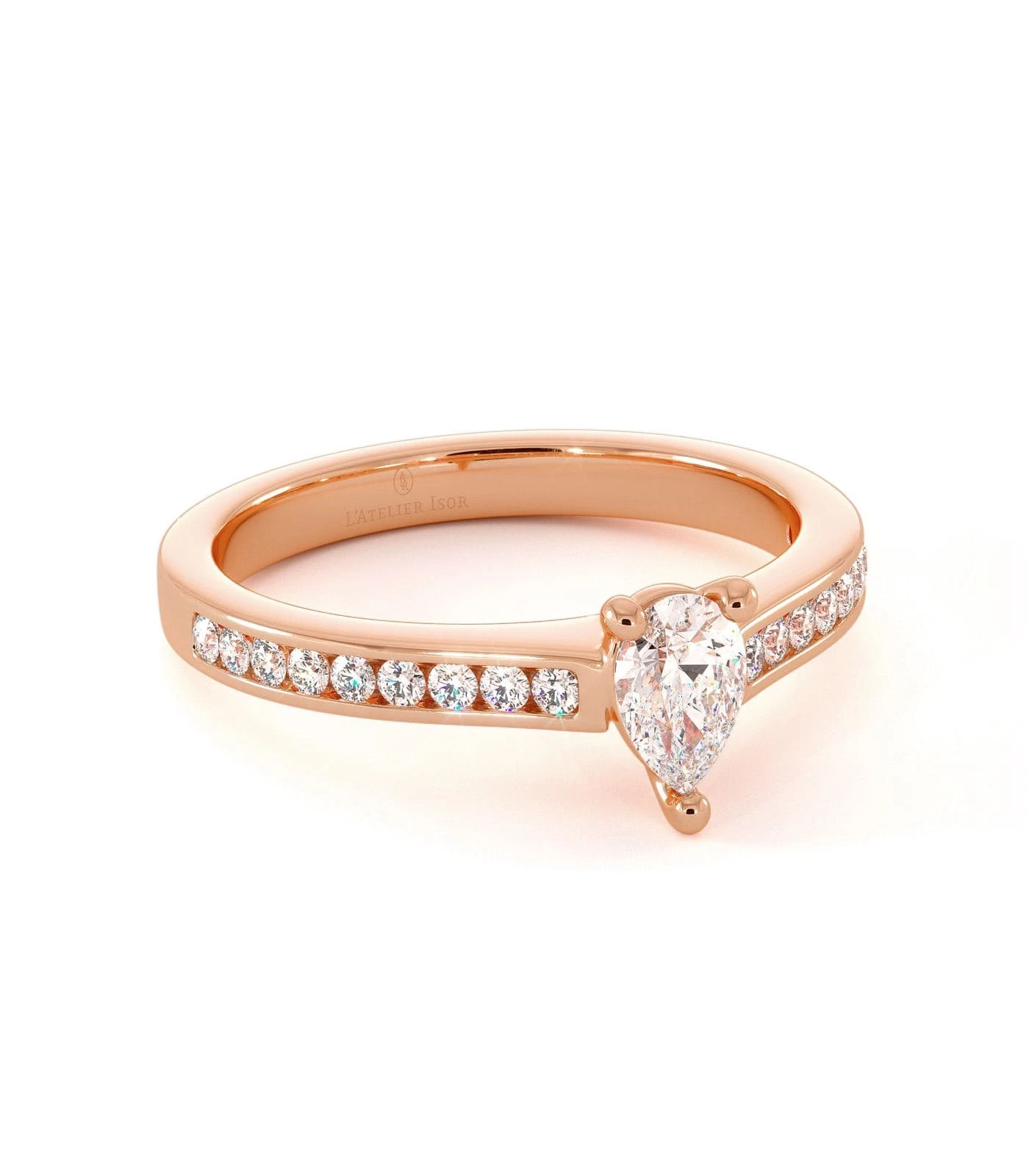 Solitaire Evoli en or 750/1000, pavé de diamants, orné d’un diamant central taille poire de 0,35 ct. Poids total diamant : 0,60 ct.