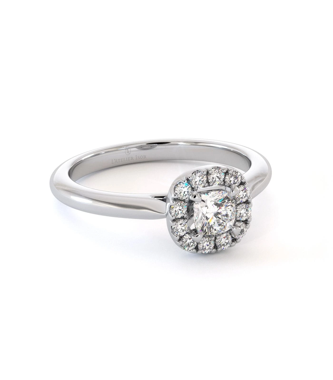 Solitaire Galil en or 750/1000, serti d’un diamant taille coussin de 0,35 ct, souligné par un halo ajouré.Un design raffiné et structuré, idéal avec l’alliance Riviera.