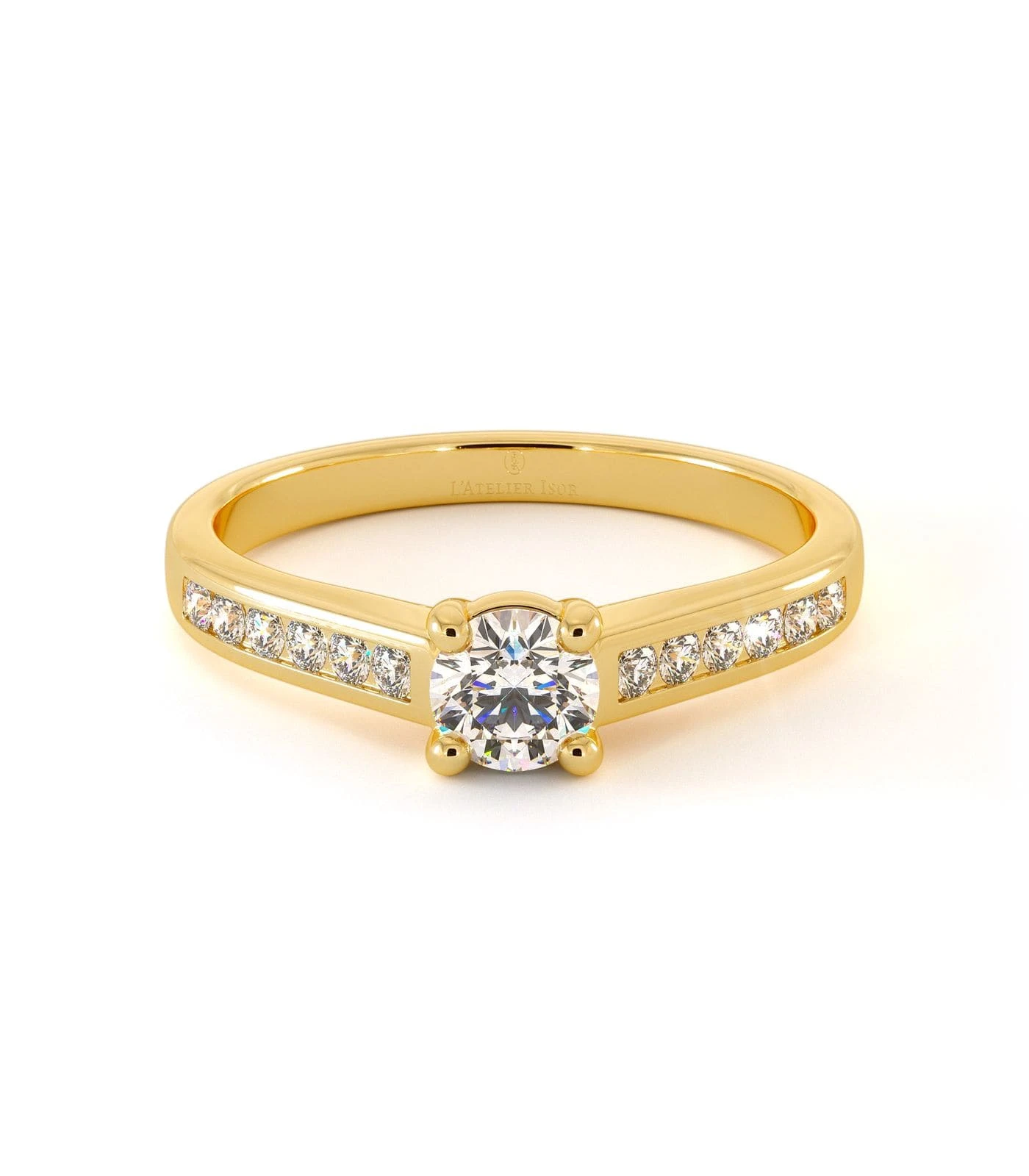 Le solitaire LEVENZO en or 18 carats, incarne le chic et la pureté grâce à son diamant central de forme ronde. Son pavage de diamants brillants vient compléter les extrémités de son corps de bague pour un résultat éblouissant. Le design simple et épuré de la bague de fiançailles LEVENZO apportera élégance et brillance à votre main. Cette bague ravira particulièrement toutes les femmes délicates et sophistiquées. Ce modèle s’associe divinement avec l’alliance RIVIERA, une bague de mariage au style délicat et élégant. Le solitaire LEVENZO est réalisable avec un diamant central de 0.20 à 0.55 carats d’une beauté aveuglante.