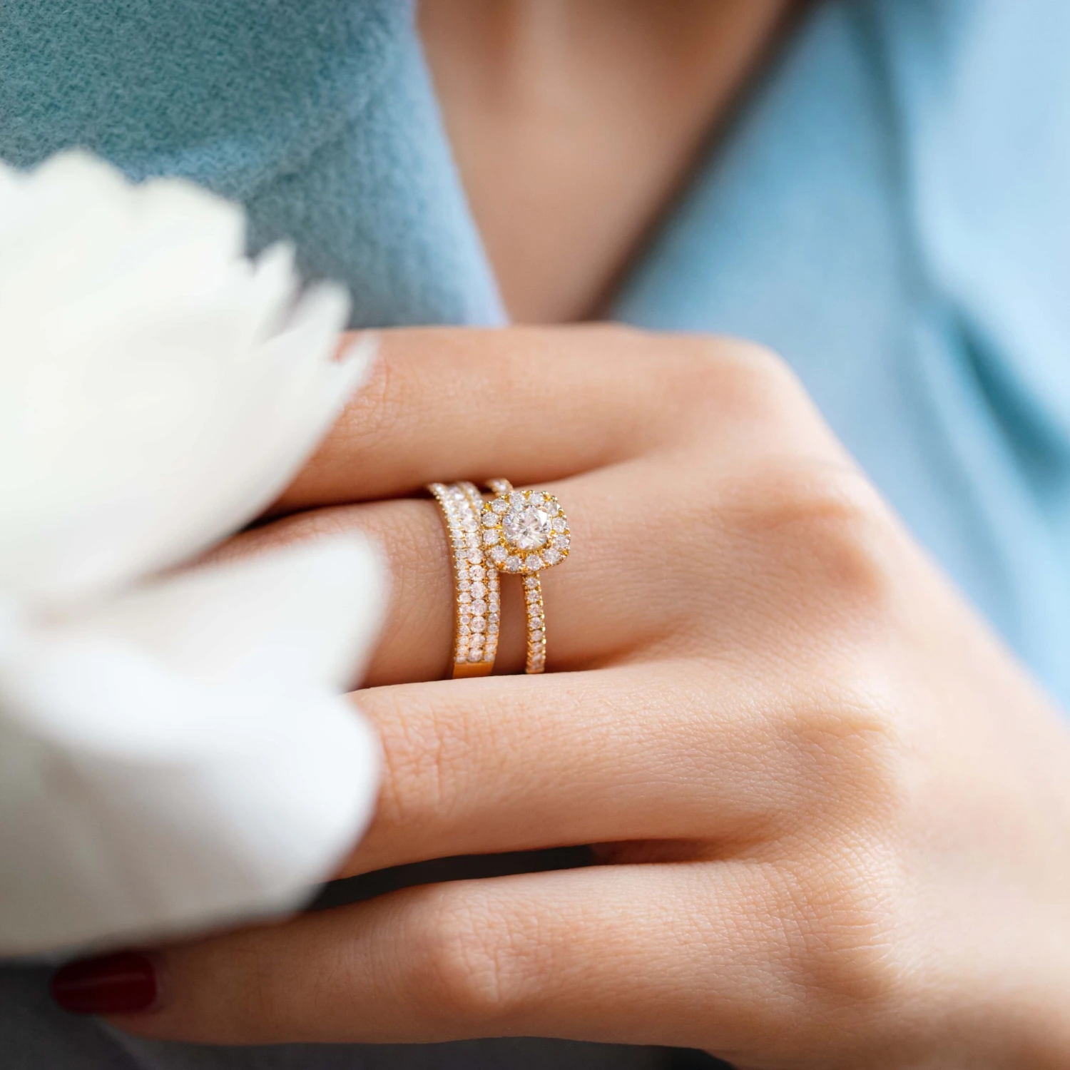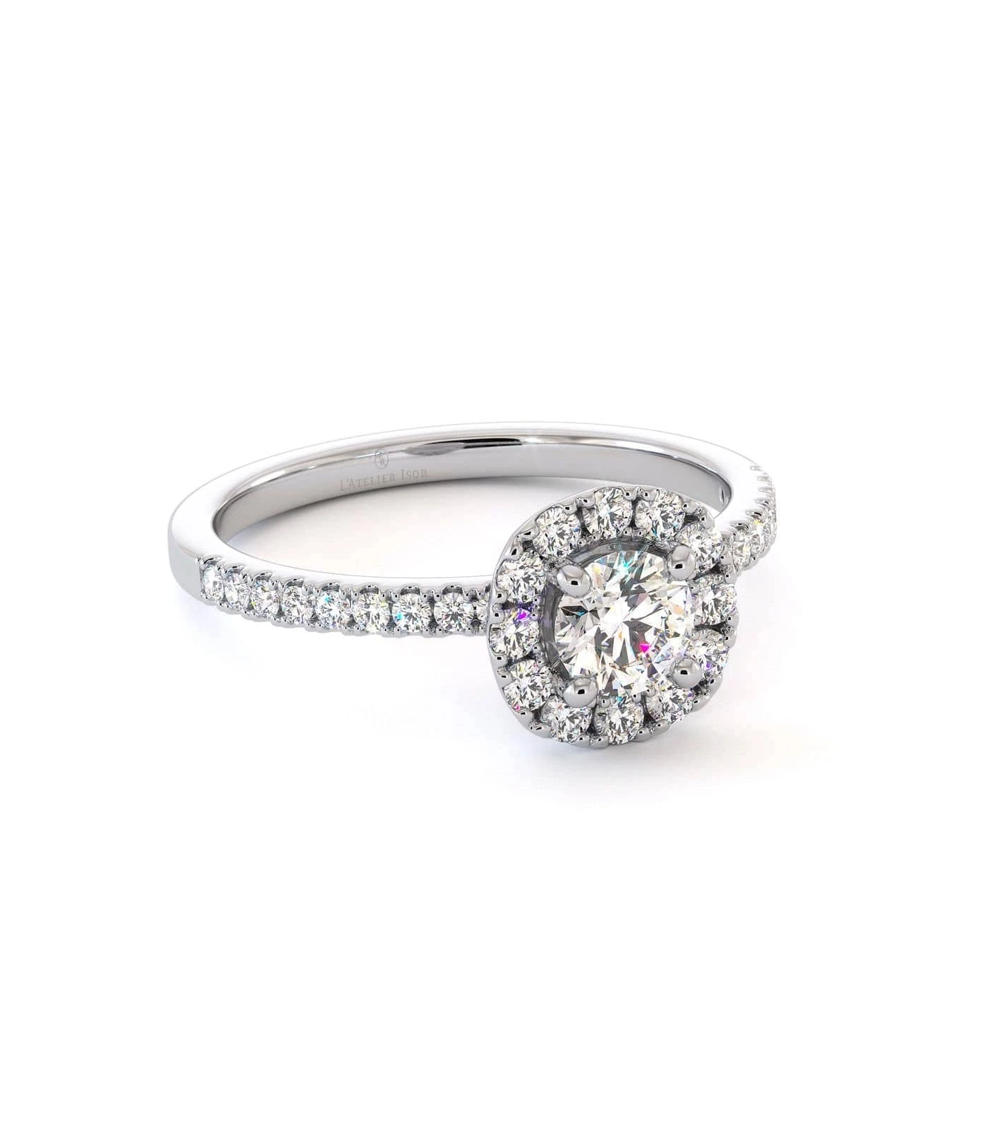 Iconique, ravissante et généreuse en éclat, la bague de fiançailles LYRE en or 18 carats est sertie d’un diamant central de taille brillant sublimé par un halo de diamants. Une ligne de merveilleux petits diamants brillants épouse parfaitement le tour de la pierre centrale et le long du corps de bague pour un rayonnement suprême. Il saura divinement sublimer votre style par sa touche éclatante. Bien qu’il suffise à lui-même, le solitaire LYRE se porte à merveille avec l’intemporelle alliance MAKIAN ou la raffinée DUNE.