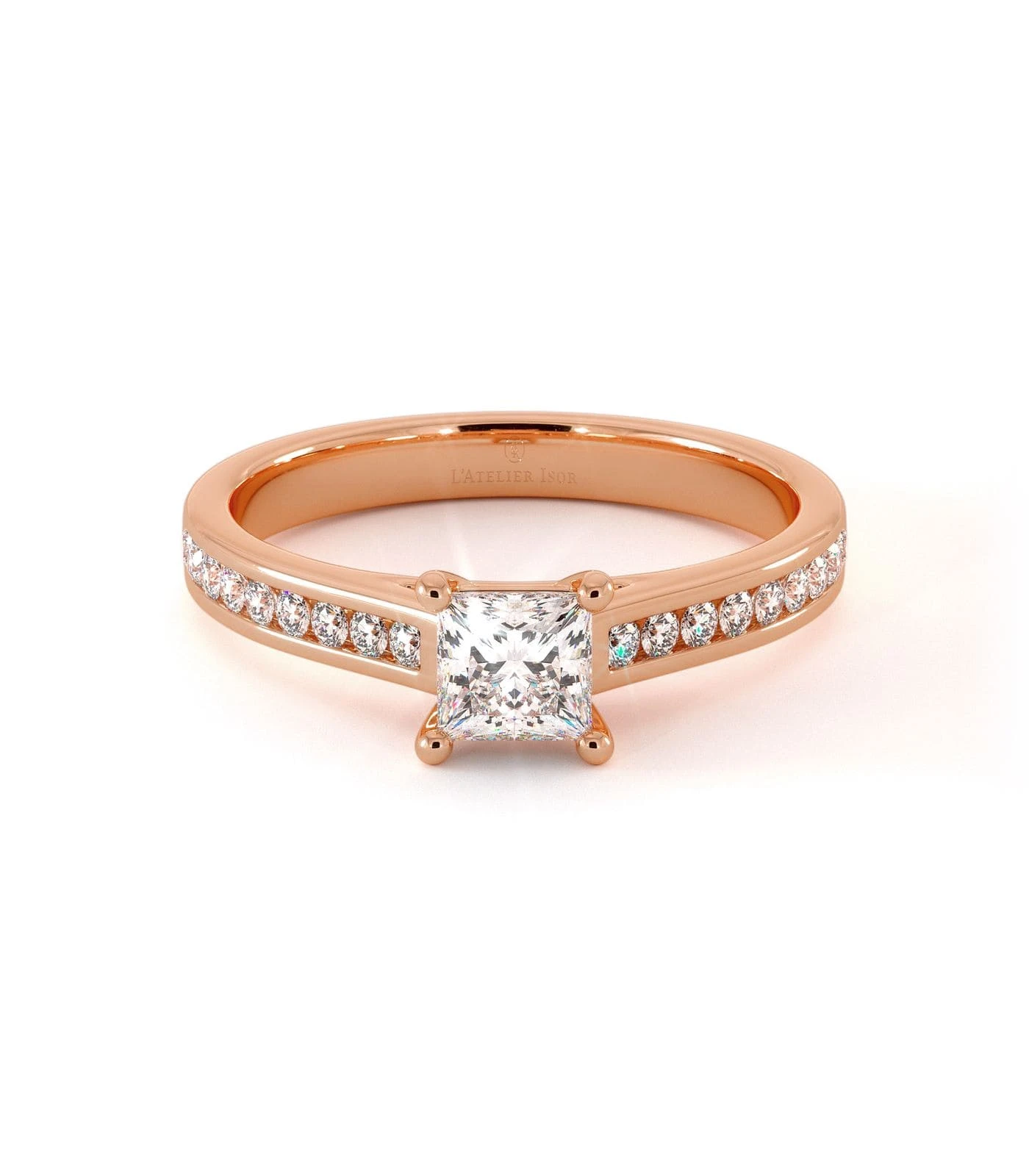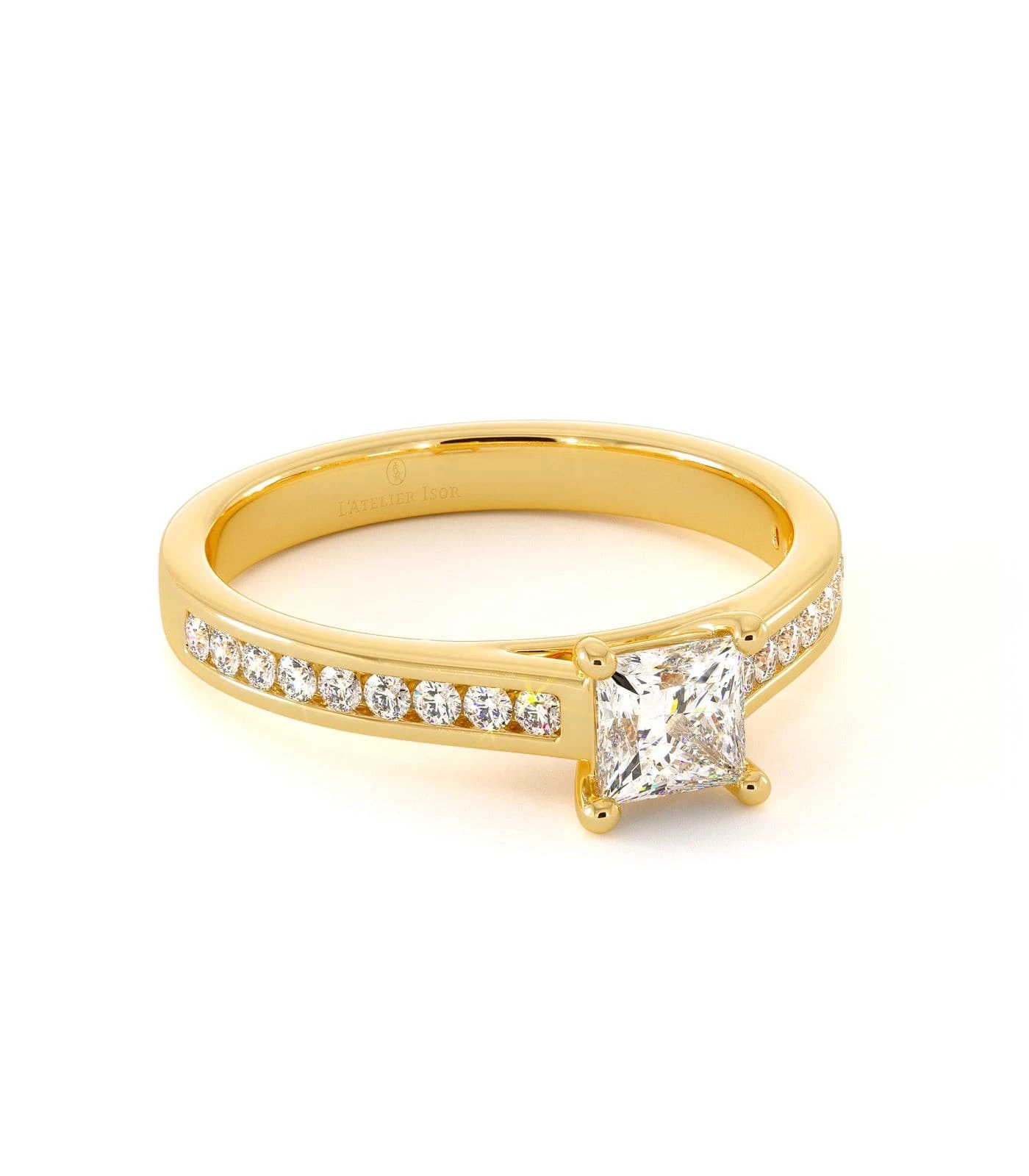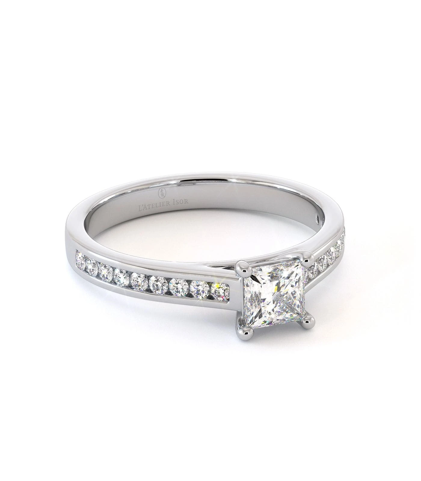 Le solitaire MARJOLAINE en or 18 carats saura vous ravir le long d’une vie par son éternelle délicatesse. Son diamant central taille princesse est mis en valeur par la finesse de son corps de bague pavée de diamants scintillants. La bague de fiançailles MARJOLAINE, par sa forme et son élégance, est le solitaire idéal qui charmera une femme au style moderne et original. Le modèle MARJOLAINE peut aussi bien se porter seul qu’accompagné de l’alliance PALMYRE qui accentuera sa brillance infinie. Cette monture est réalisable avec un diamant de 0.20 à 0.70 carats.