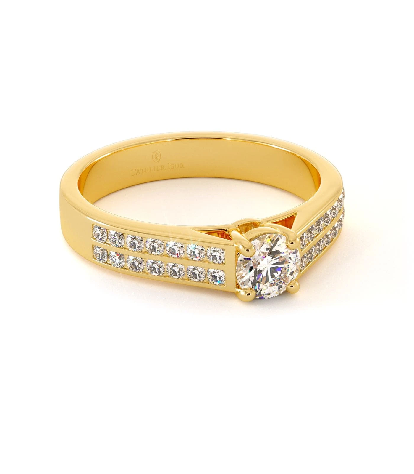 Le solitaire PONZA en or 18 carats saura illustrer votre amour. Son diamant central de forme ronde est sublimé par sa monture charnue. Incrustée de deux rangés de petits diamants sertis rail, la bague de fiançailles PONZA est d’une brillance extraordinaire. Réalisable avec un diamant central de 0,20 à 0,50 carats, le modèle PONZA est un bijou au style élégant.