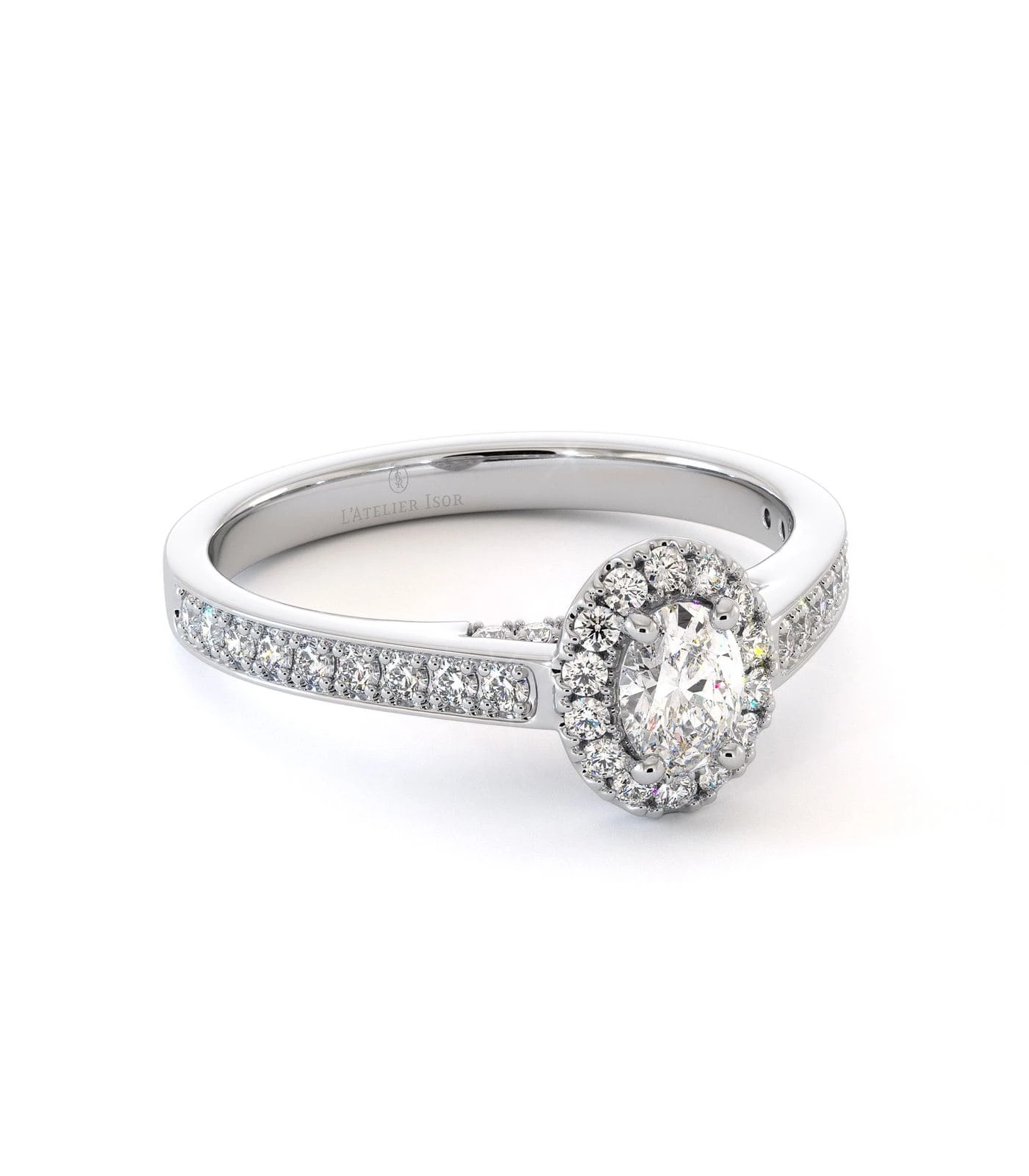 Solitaire Purple Rain en or 750/1000, sublimé par un diamant ovale de 0,25 ct, entouré d’un halo et d’un pavage délicat aux finitions perlées.