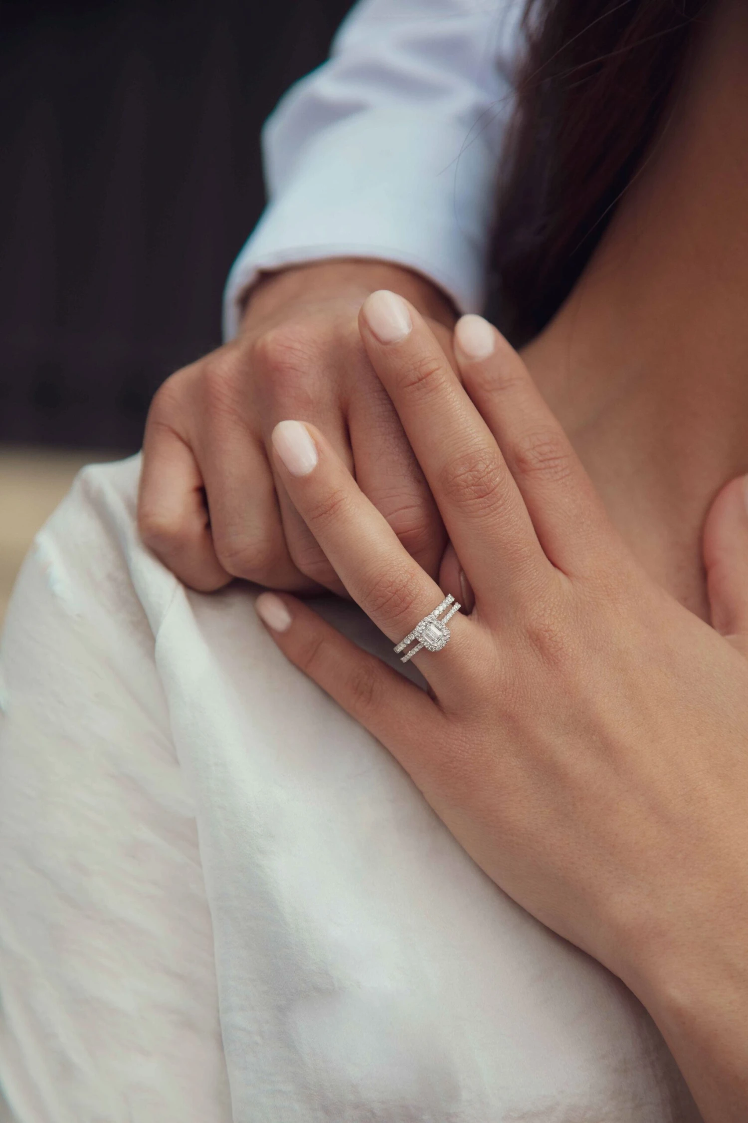 Best-seller de la Maison, le solitaire Sahel en or 750/1000 est rehaussé d’un diamant taille émeraude et d’un halo lumineux. Un classique éclatant à associer avec l’alliance Makian.