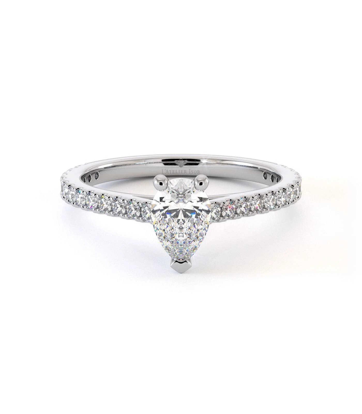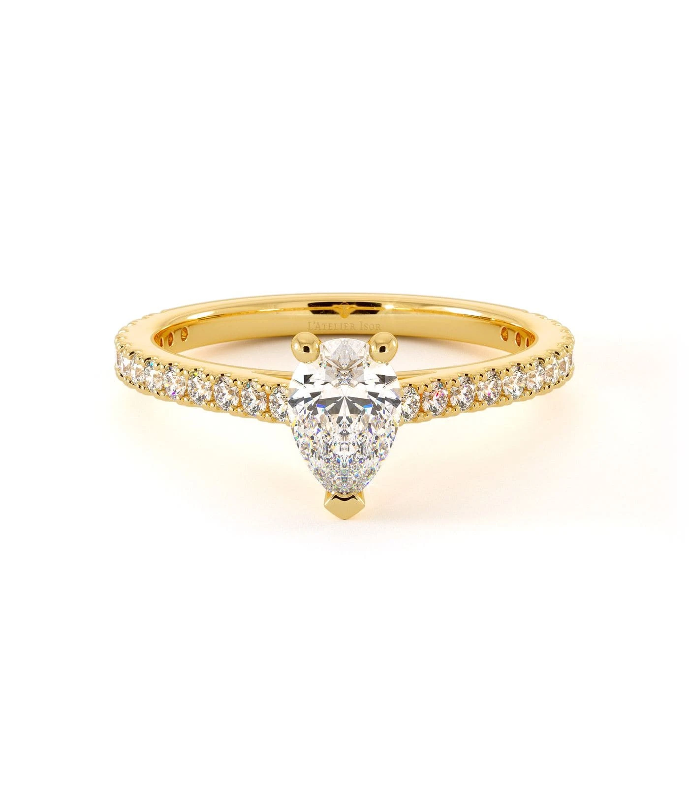 Solitaire Terra en or 750/1000, pavé de diamants, orné d’un diamant central taille poire. Un design fin et lumineux, idéal seul ou accompagné de l’alliance Makian.