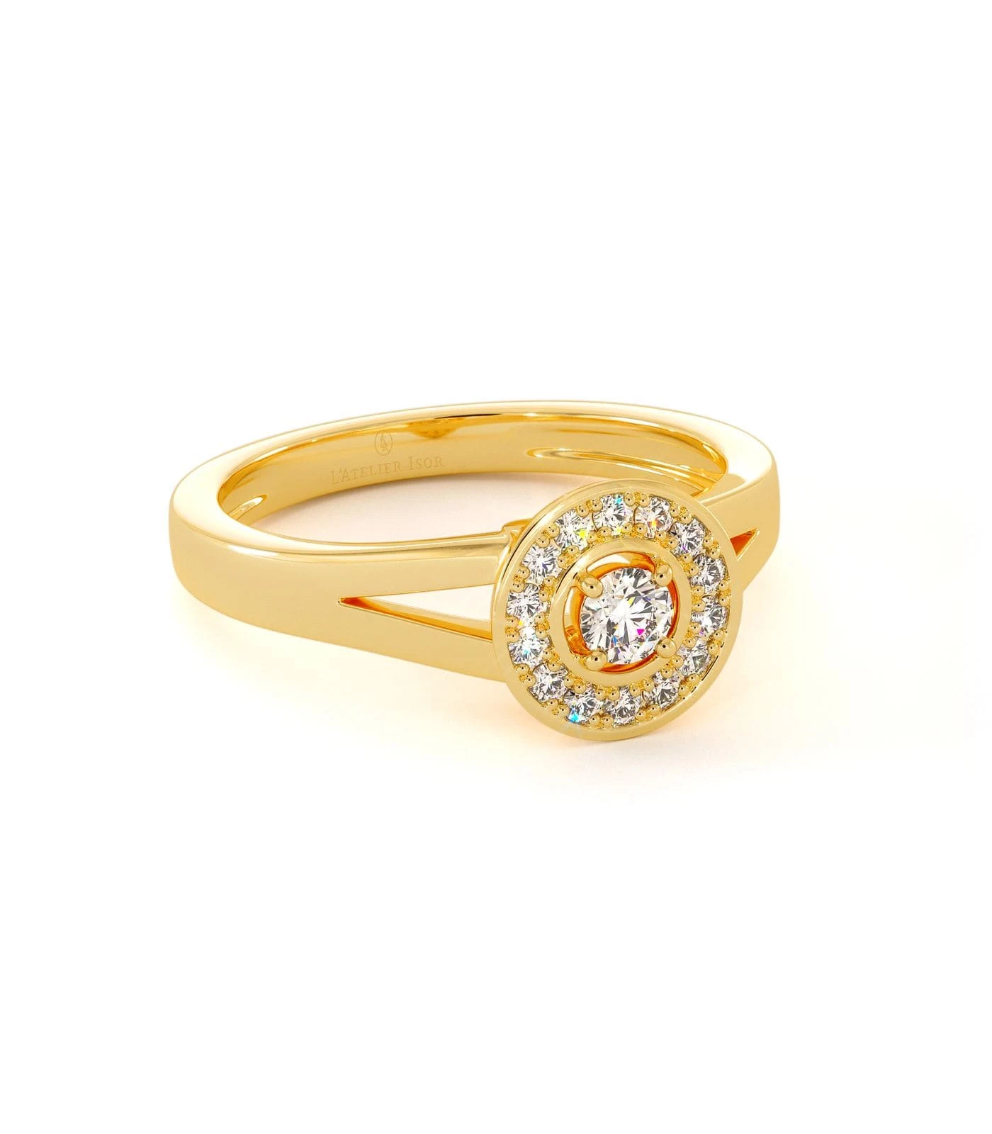 La bague de fiançailles TOKARA se distingue par sa sublime monture ajourée et son radieux diamant central 0,10 carats taille brillant. Une magnifique pierre précieuse encerclée d’un halo de petits diamants brillants venant accentuer la beauté et la pureté du bijou. Son anneau aux surfaces lisses et brillantes, se sépare pour se retrouver de nouveau au centre lumineux de la bague. Original, le solitaire TOKARA vous accompagnera à vie pour capturer l’éternité de votre histoire d’amour.